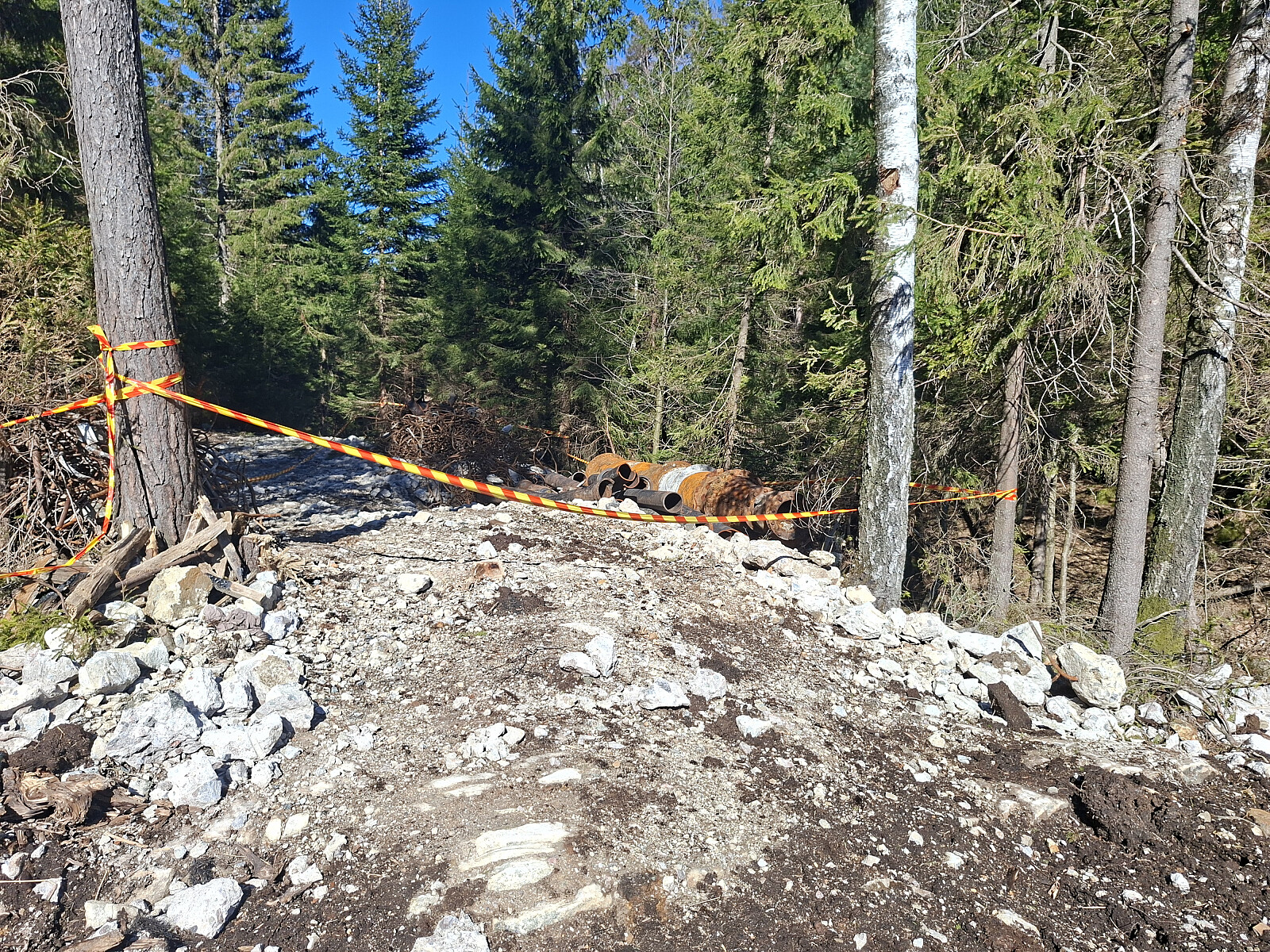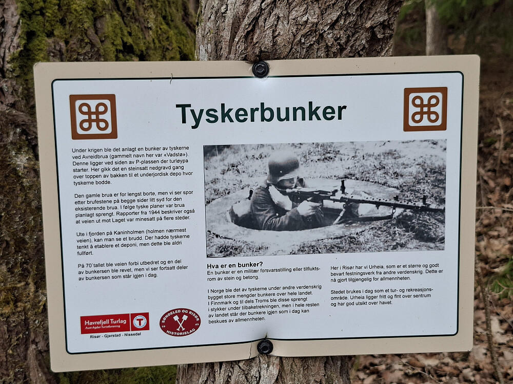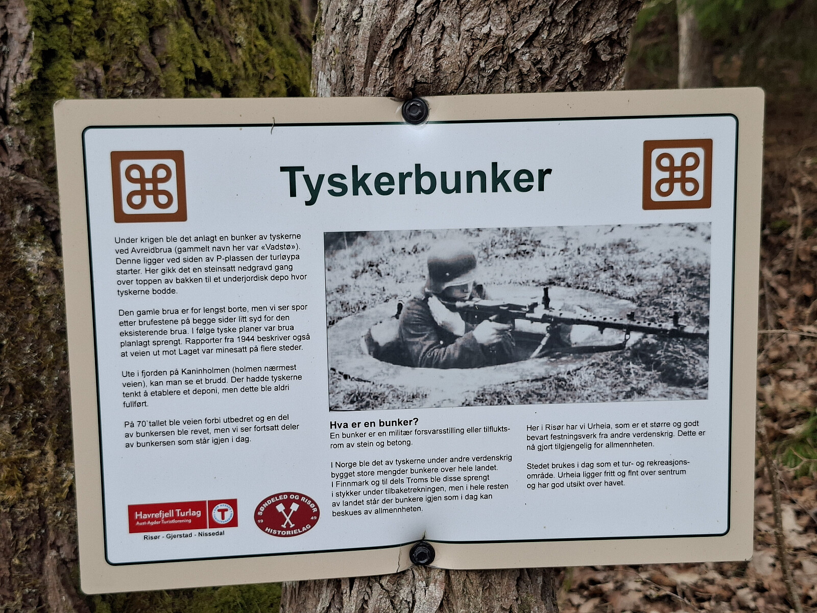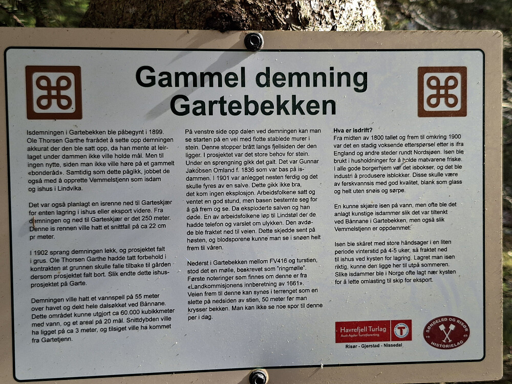 Kjørte Fv416 mot Risør og tok til høyre mot Laget. Til venstre rett etter krysset ligger turparkeringen. Her er det satt opp infoskilt med kart over stier i området. Ved parkeringen er det rester etter en tysk bunkers fra 2.verdenskrig. Parkerte og fulgte skilting mot Gartetjenn. Veien følger Kvernhusbekken oppover til stidele. Tok her til venstre mot Skardalen og Myrtjenna. Etter 300 meter forlot vi stien og gikk i terrenget mot toppen. Selve toppområdet er ganske flatt. Det er foretatt hogst her i vinter så det er litt kronglete å gå fram til der toppunktet skal være. Ingen markert topp og ingen utsikt. Tilbake holdt vi oss utenfor hogstområdet og gikk stort sett i lyng ned til vi møtte stien igjen. Fortsatte mot Gartetjenndammen. Dammen er har ikke vært i bruk siden 1980 tallet og blir nå revet av Risør kommune. Dammen ble etablert i 1924 for å bringe vann til Risør Tremassefabrikk på Krana i Risør.Om Risør Tremassefabrikk