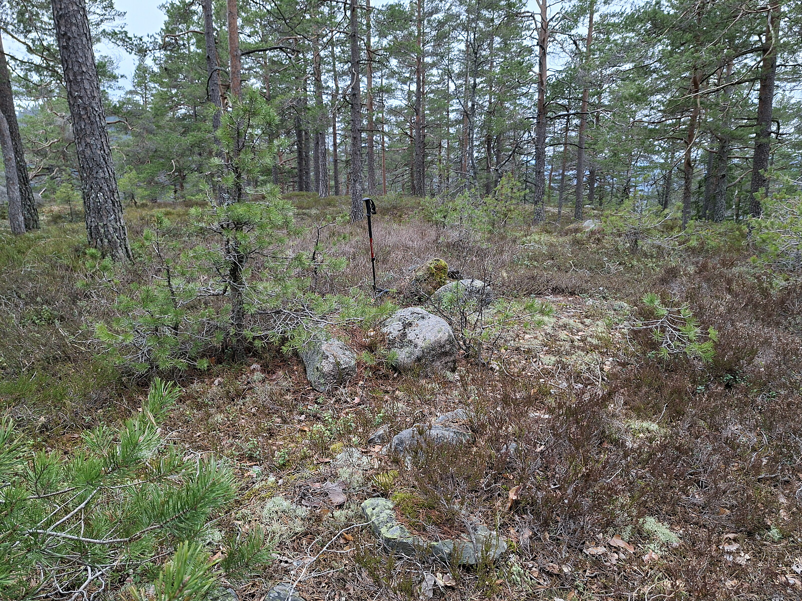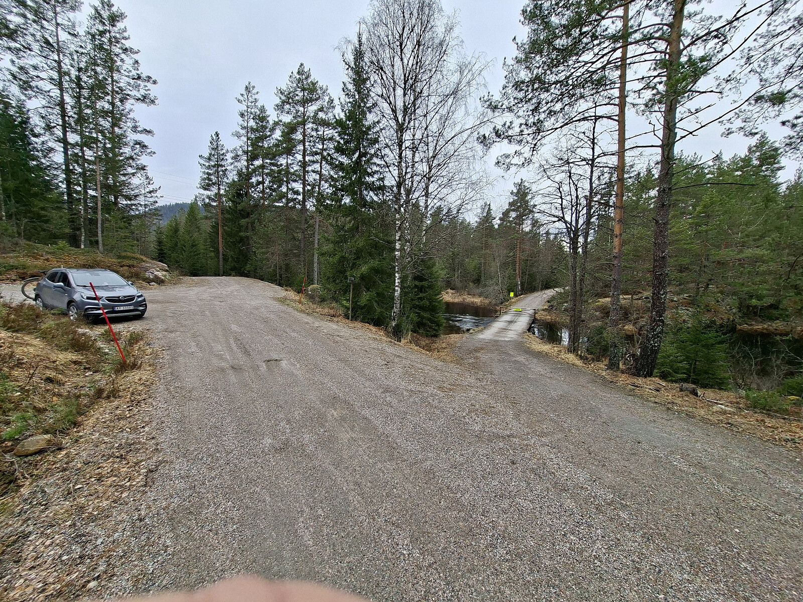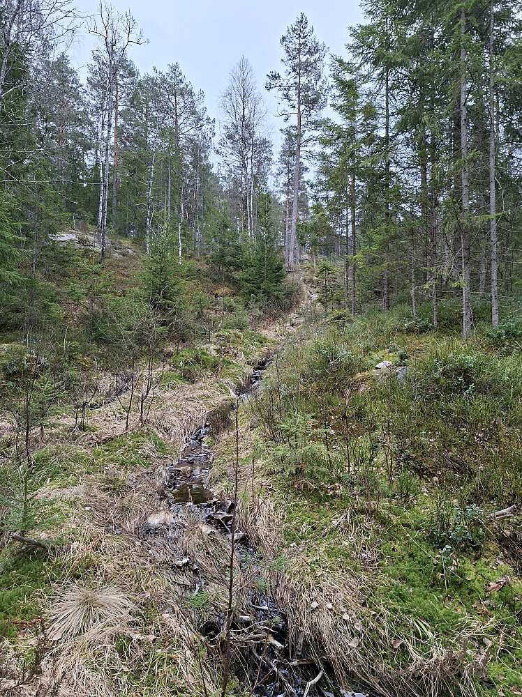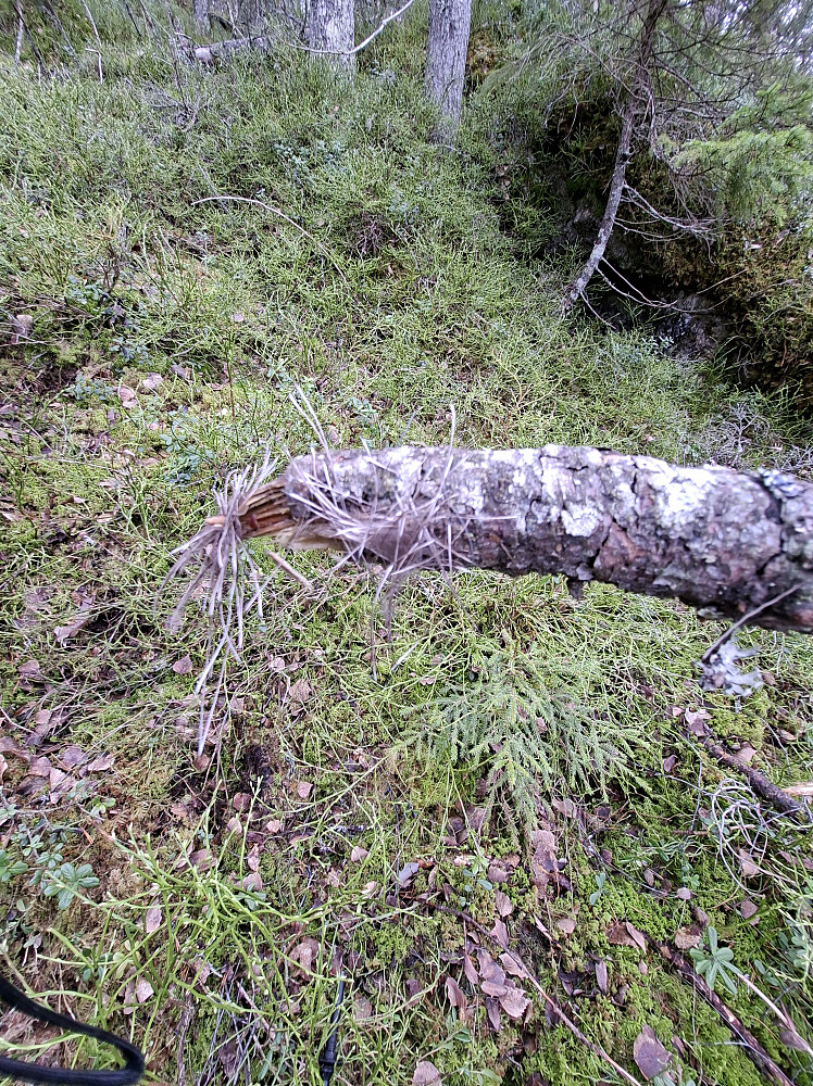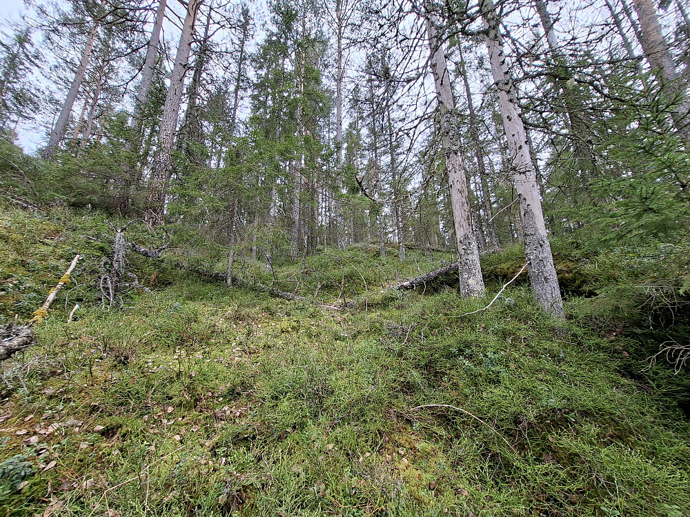 Etter Tiurkollen kjørte jeg ut til Melum og tok Rv 36 nordover og svingte inn til venstre mot Tveitan. Fulgte veien i 4,5 kilometer til kommunestua parkeringslomme. God plass til mange biler. Tok med sykkel og lurte meg forbi bommen på brua. Fulgte fin grusveien ca 800 meter til jeg så vannet. Fant en gammel traktorslepe opp til venstre mot ett gammelt hogstfelt. Fulgte dyretråkk, senere ble det busking myk mose og lyng. Jevnt bratt og tungt å gå. Måtte ta ett par hvilepauser. På kote 300 går det en kløft på tvers. Gps sporet leder til en lett kryssning. Relativt flatt inn til toppunktet. Toppen er ikke markert. Ingen utsikt.