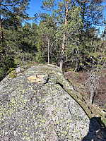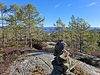 Toppen er markert med en varde og litt bortenfor på toppunktet er det bolter etter gammelt Trig.merke. Litt utsikt østover mot Vealøs tårnet og Vindfjell. Retur samme vei.