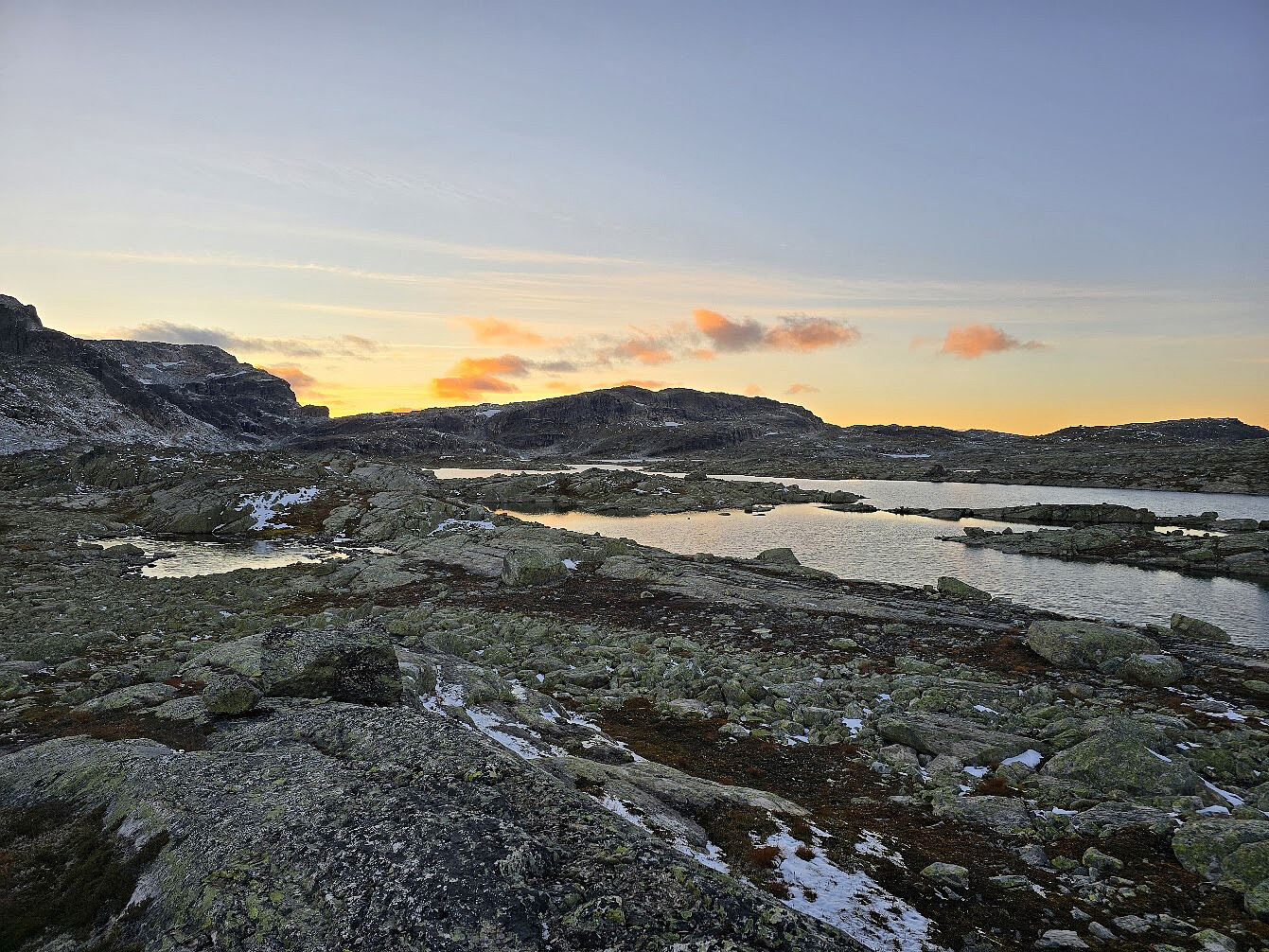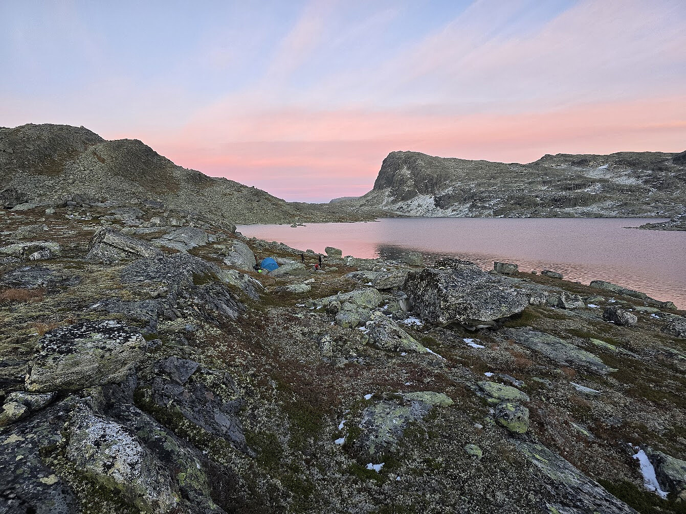 Vel oppe ved Kyrkjedørvatni gikk jeg nå ut på «øya» som skiller de to bassengene – og jeg fant meg en OK plass som lå sånn nogenlunde i le for vinden. Det var dog ganske kaldt så halsen var ikke helt grei. Det ble noe fisking – men jeg syntes det ble litt kaldt. Så vandret litt rundt før jeg fikset meg litt middag. Det ble enkel rett i koppen suppe og brødskiver – jeg gadd ikke kjøre på med drytech – det er så kraftig kost. Sola gikk ned ca 19:25 så det ble noen flotte bilder, før jeg trakk meg inn i teltet for litt lesing. Etter hvert sovnet jeg men våknet etter noen timer – det var bikkjekaldt. Så selv med ullsokker, ullstilongs, ulltrøye, tykk ullgenser, tullet inn i en termolakenpose og inni soveposen – ble det veldig kaldt. Tok på en boblejakke i tillegg – så da gikk det bedre. Sov en helt OK natt.