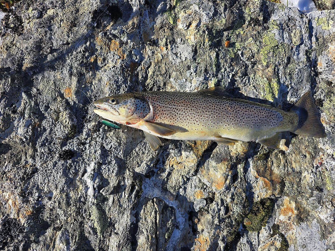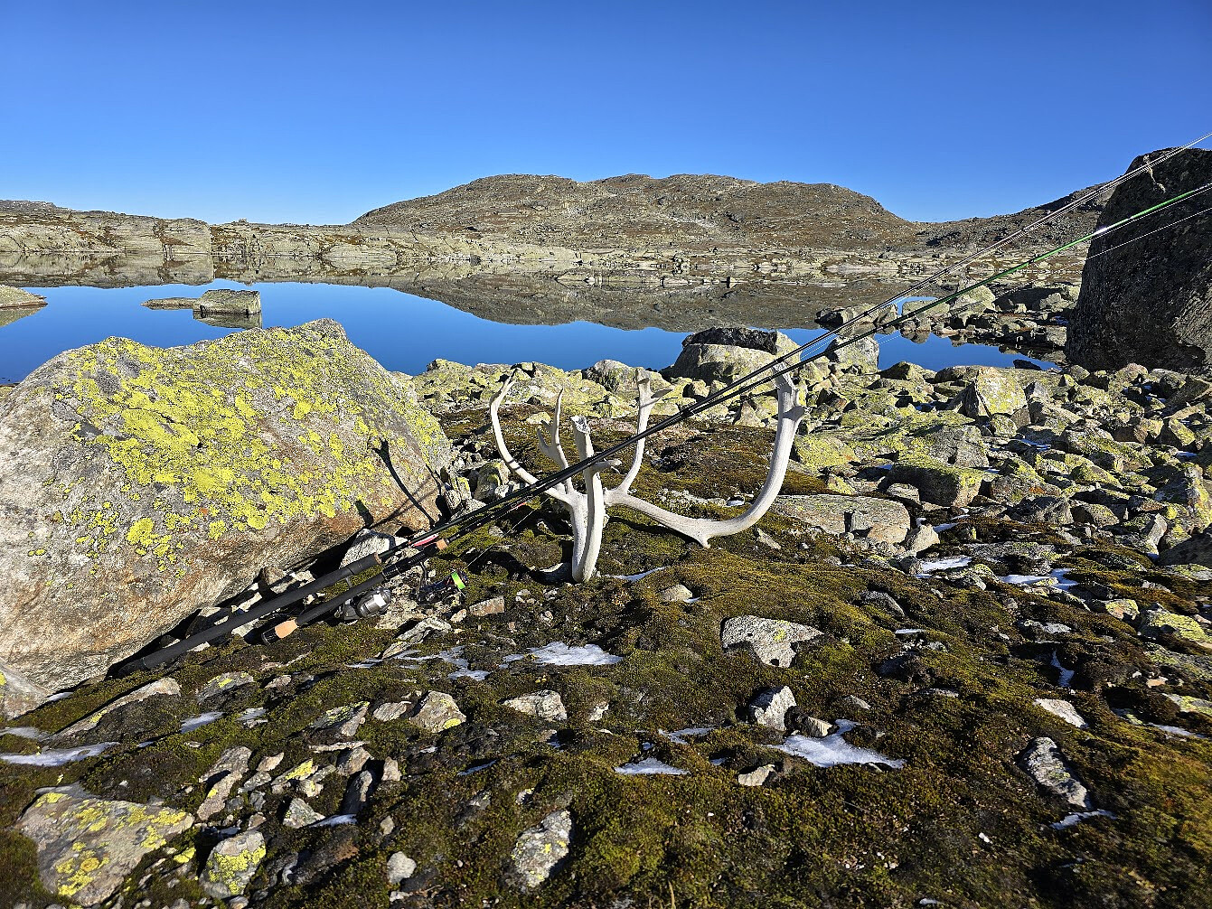 Neste morgen var det skyfritt og fullstendig vindstille. Før sola kom opp så var det ganske kaldt – men når sola var der koste jeg meg skikkelig. Det ble 5 timer med vandring og fisking. Delvis på steder jeg ikke testet i sommer, men endte på et sted jeg kjente til fra før. Der ble det en flott ørret. En til i omtrent samme størrelse mistet jeg i det jeg skulle hekte den opp i håven. Etter hvert gikk jeg litt lei og tilbake ved teltet så fileterte jeg fisken og fikset middag.