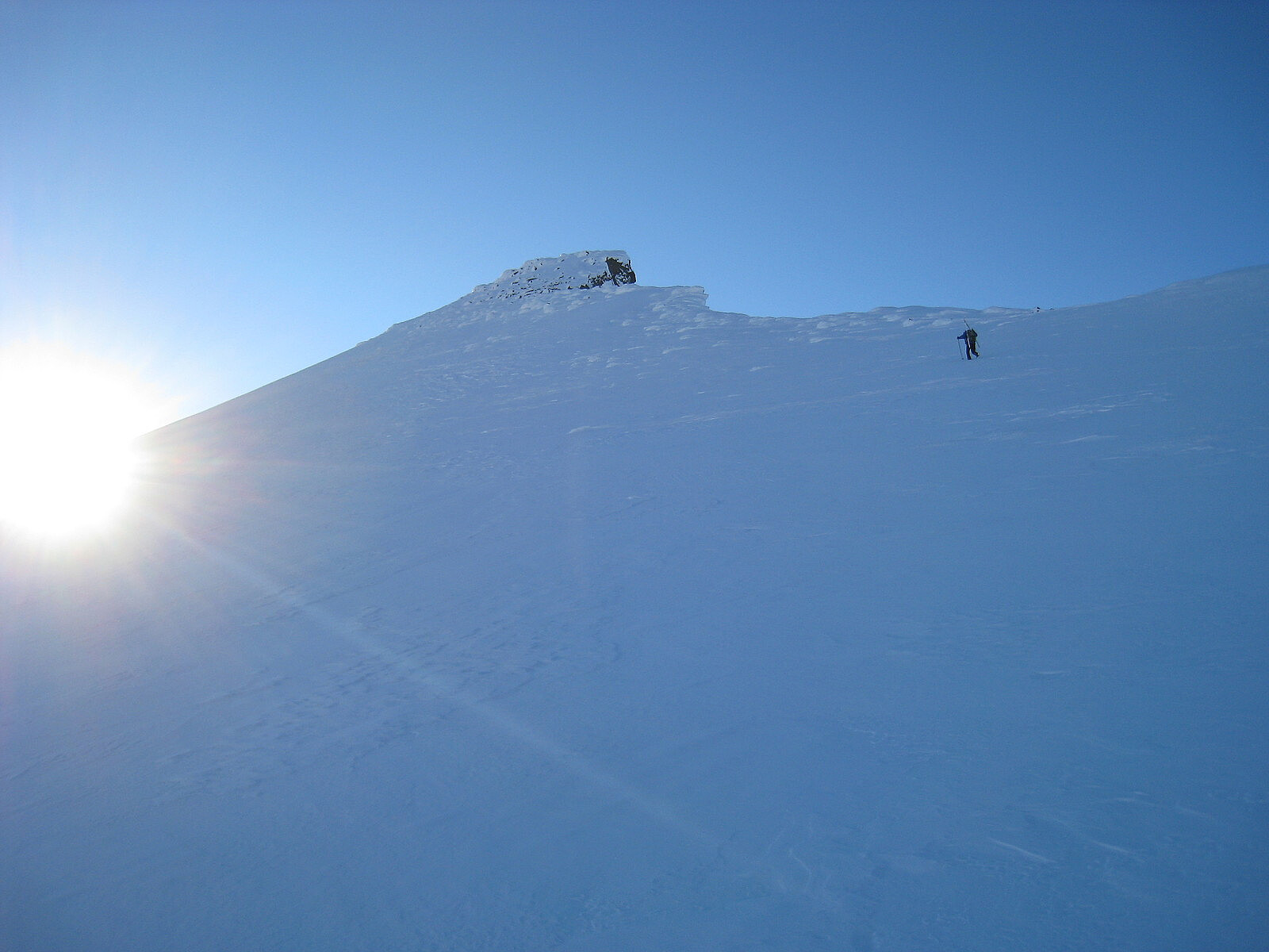 Synes det var jævlig langt til toppen denne dagen...men med korte stopp opp den ikke altfor bratte bakken opp mot Austre Nautgardstind gikk det nå greit. Geir Arne sprintet oppom denne mens vi andre skrådde etterhvert direkte mot hovedtoppen. Det var nå skygge og meget kaldt. Vi gikk raskt og greit opp den siste kneiken...En super utsikt, men det var for kaldt til å kose seg på toppen denne dagen. Geir Arne gikk bortom Nautgardsoksle mens vi andre startet på den HARDE veien nedover. For det var virkelig hardt. Jonas hadde randonne så han cruiset nedover. Odd Arne falt tre ganger...ei skikkelig kollbøtte og jeg var engstelig.... Jeg safet skikkelig,- men så måtte jeg også overende. Da måtte jeg selvfølgelig falle ned mot venstre...ikke hardt, men på min svake skulder og det ble katastrofe. Jeg hylte av smerte...og skjønte at dette var alvorlig. Hva gjør man i en sånn situasjon? Jonas tok sekken...Kaldt som f...langt fra folk. Måtte jo bare komme seg ned. Helt i transe og smerte ville jeg forsøke å komme videre nedover. Klarte å falle TO ganger til på samme skulder og skrek som en stukken gris. DA vurderte jeg å ringe 113.....flere ganger...men så skogen nærme seg der nede...IKKE helikopter på denne karen...men kanskje Røde kors og snøskuter.. Men tok meter for meter og klarte å komme meg ned til bilen uten flere uhell....men staven hektet seg to ganger i kvist bak meg....og DET var vondt.