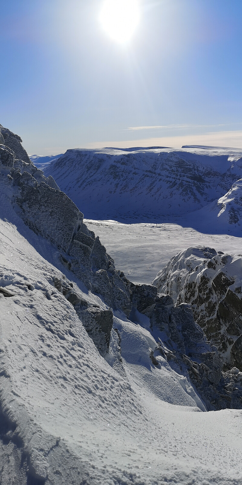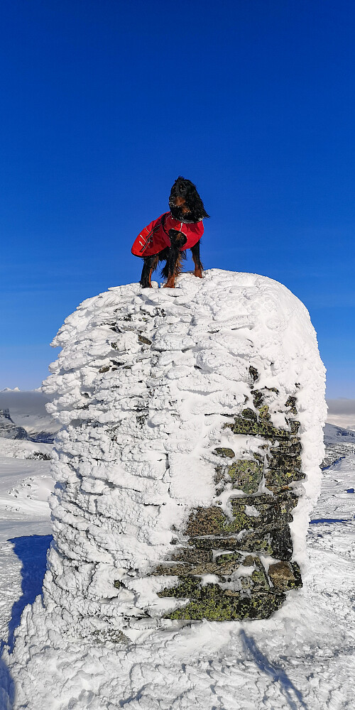 Vi kom overraskende greit opp på sadelen mellom Vesttoppen og Grindane. Nå var det lett å skreve over gjerdet. Bra med snø, men ujamnt. Vi gikk et stykke oppover og satte igjen ski opp i bratta og fortsatte greit til fots med staver. Siste biten gikk greit, men manglet et gir denne dagen. Plutselig var vi oppe til en fantastisk utsikt og helt vindstille rett sør for varden. Helt konge. Embla koste seg og ble dronninga på varden i dag. Måtte ta av henne sokkene nede i bratta slik hun fikk brukt sine "naturlige stegjern" Det ble en del fotografering og vi nøyt godværet og den rå utsikten til alle kanter.