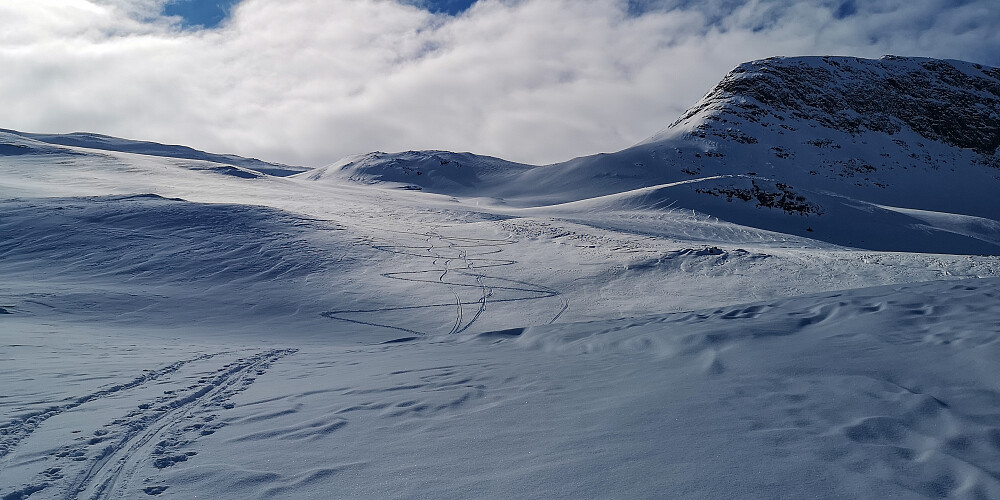 Veldig greit å gå videre og jeg øynet et håp om at det var mulig å fikse toppen idag likevel. Da jeg kom opp på ca 1500moh der man kjører ned på 1459 vannet,- bestemte jeg meg for å snu. Tåke på toppen og jeg hadde jo masse flott nedkjøring foran meg. Skiftet til tørre klær og tok av feller og fiksa støvler. DA kom sola forsiktig fram og ting begynte å skje. Klokka var nå ca. 14.30 og følte at det var seint nok. Det ble en fantastisk nedkjøring. Glemmer ikke den med det første. Sola kom nå for alvor og den varmet godt. Helt alene i fjellet.