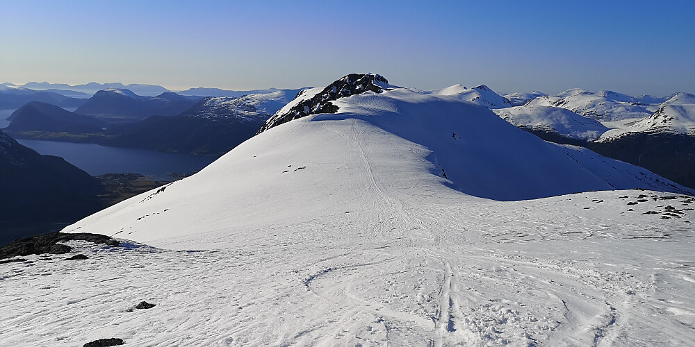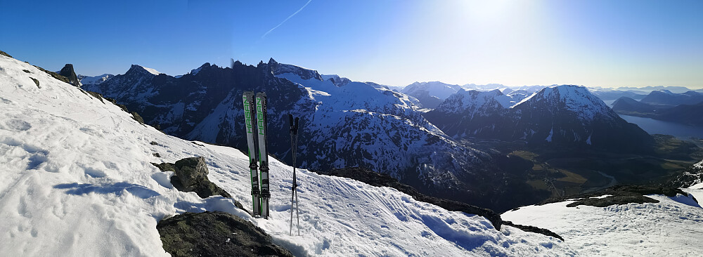 Tur alene på Rando idag. Praktfullt vær. Kom seint til Venjedalen og fikk en del skygge før jeg kom opp på ryggen. Greit føre, men var noe hardt i nedkjøringen i flanken ned igjen. Helt alene på toppen med eventyrlig utsikt. Helt vindstille og hadde nettingtrøye og det var nok. Ellers.. godt påkledd ned i skyggen igjen... og med hjelm!