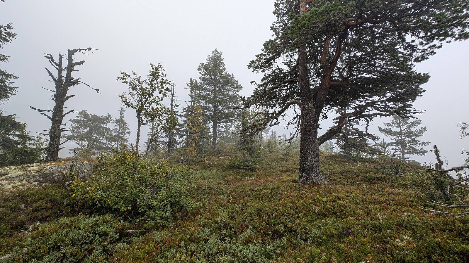 Et flott toppunkt her oppe blant gamle fine furuer. Utsikten er nok super her oppe, men i dag var det vel heller dårlig. Tur med Roger og Embla.