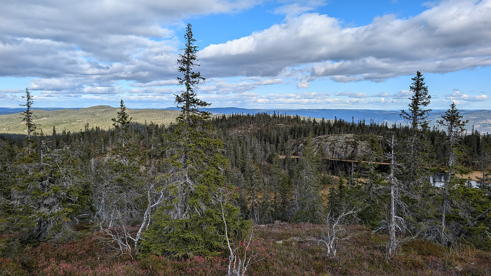 Etter turen til Skurveknatten kjørte vi noe nedover og fulgte en annen grusvei langt sørover. Fant et fint utgangspunkt for turen der en gammel "vei"...bredt tråkk førte oppover i terrenget. Denne turen ble derfor mye enklere enn antatt. De siste 100 hm måtte vi "bushe" litt, men terrenget var helt greit. Gikk først oppom den "grønne nåla" før vi gikk lett videre mot hovedtoppen. Overraskende fint bort dit og oppe på toppen. Matpause med flott utsikt mot Skurveknatten bl.annet. Forsøkte å følge samme kurs ned igjen og det fikset vi ganske bra.