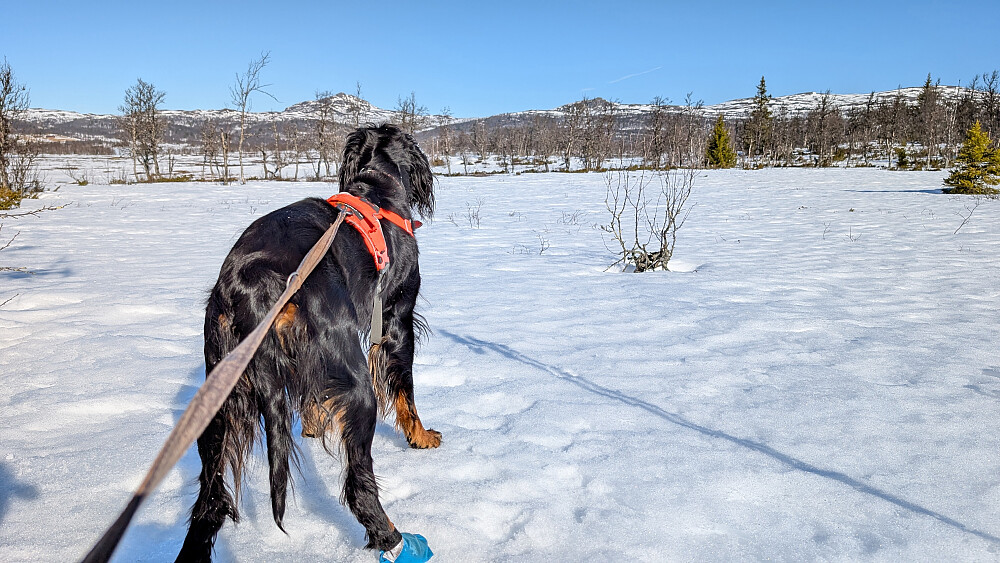 Dette ble virkelig en høydare., men synger på siste verset nå med snøen. Embla måtte holde seg i bånd idag, men vi fikk da se noen ryper på turen.
