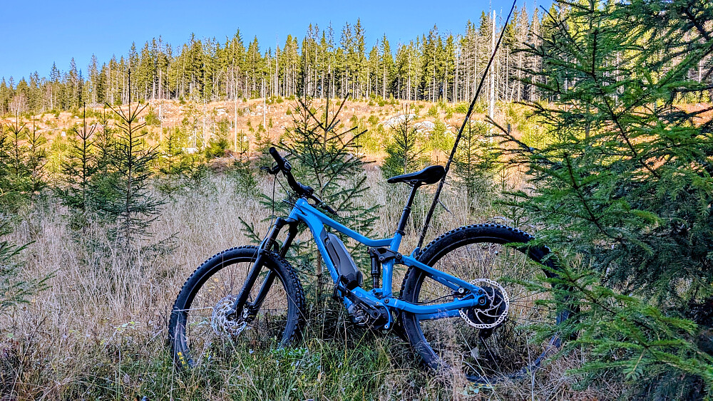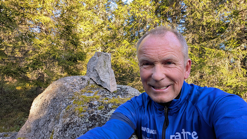 Parkerte sykkelen rett under selve toppen. Kun ca 300 m opp til toppunktet som er markert med en liten varde. Dårlig utsikt på denne skogstoppen sånn som på mange andre. Topp er topp! Tilbake til sykkelen...så gikk det rimelig fort.. så fort at jeg tok feil i et kryss. Rettet opp feilen og raste nedover i 50 km/t stedvis. Godt med en trygg god sykkel.