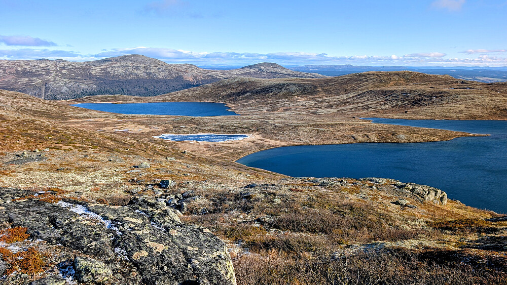 Gode stier, gode bein og lett terreng der jeg gikk utenom stier,- gjorde at jeg tok sjansen på en lengre tur idag. Det var litt uggent terreng terreng opp til Rundhøa S og derfra bort til ryggen på Krusgravkampen. En del busker og kratt som var trasig å gå i. Ellers en super dag med fast underlag og god sti. Det blir nok flere turer i dette området.