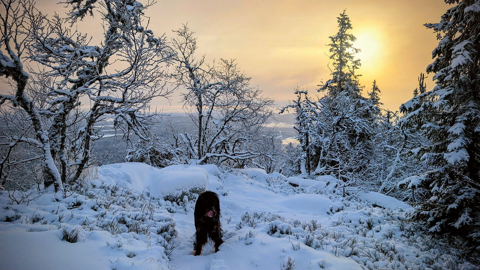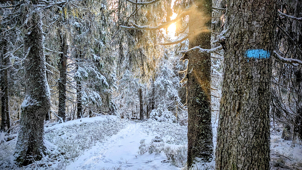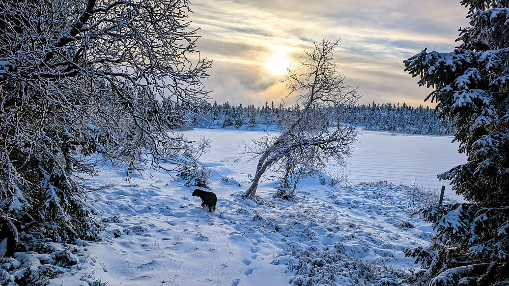 Fin tur alene med Embla. Gråvær og tåkete nede ved Torsætra, men rimelig flott oppe i høyden...som det ofte er. Ca 1 minus, 5-15 cm nysnø. Herlig i skogen idag. Glatt ned bratta så der burde jeg hatt brodder.