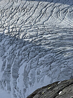 Det ble bail på denne toppen 16. mai pga usaklig sterk vind så da jeg ble ferdig med Juvass-runden min i skapelig tid denne dagen var det bare å hive seg i bilen opp til Krossbu så man fikk tikket av denne før skisesongen er ferdig. Gikk ut på fjellski med kortfell i strålende sol rundt 1545. Innen jeg rakk å komme frem til eggen øst for Søre Smørstabbtinden hadde det naturligvis skyet over, begynt å blåse opp og blitt verdens flateste lys. Ga meg ikke, fikk på meg stegjern og fant frem isøksa og fikk karret meg greit over eggen og opp til toppen. God blanding av isete gammel snø og fersk nysnø. På vei tilbake var det så flatt lys at jeg så vidt klarte å følge sporene jeg hadde gått opp kort tid i forveien. Kom meg ganske overraskende ned uten fall og var vel ved bilen >>>