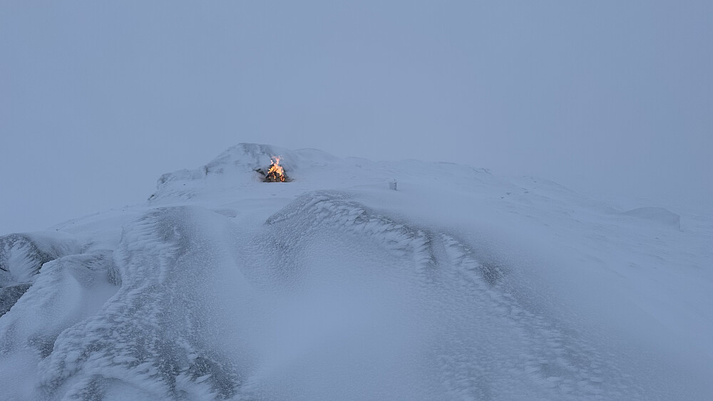 Etter halv dag på jobb var det fint å luffe opp på Eikåsnipa ein tur! Plukka med ved ifrå støylen og kjekt å lage nyttårsbålet på favoritt fjellet. Lite sikt men like fint er det! Eg kjenner utsikta og det vart bålet som gav magien i akkurat denne stunda på toppen! :)