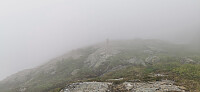 Yr hadde lova strålande meldinger...Men, det viste seg å være skivebom. Skodda låg graut tjukk med 3 m sikt då vi kom opp på ca 650 moh og i retning opp til Kringsjåsteinen 705 moh. Som vi aldri såg...Snu var ikkje aktuelt. Håpet var jo at yr selfølgelig skulle slå til som meldt og kanskje var det berre havskodda som trakk inn og spelte oss eit aldri så lite midlertidig puss. Så det var berre å dra fram GPS for å navigere etter målet. Terrenget hadde vi studert og ein har >>>