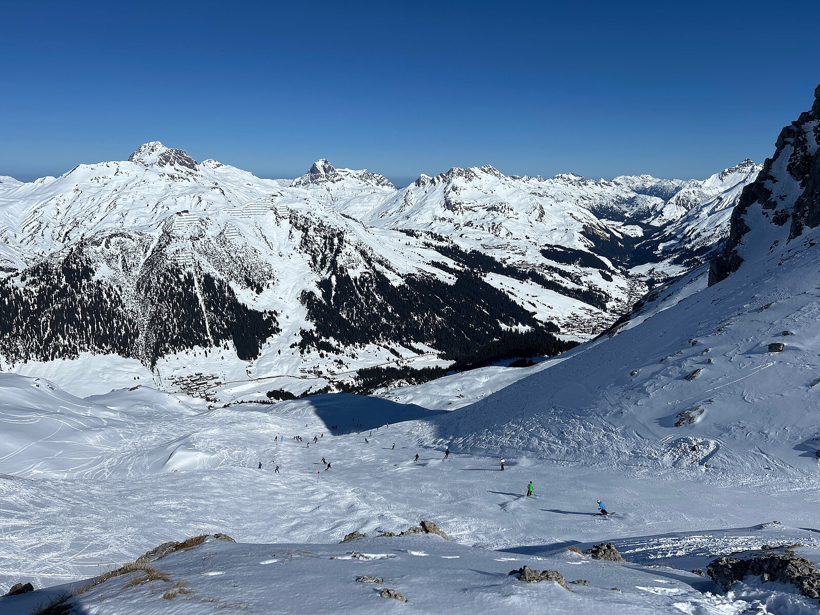 Etter det gikk det relativt greit for min del til Zürs, hvor det igjen ble noen ekstraheiser fordi jeg ikke skjønner meg på løypekart, før jeg kom meg over til Lech. Lunsjen der ble av det enkle slaget: Inn på en Spar-butikk og en baguette, croissant og en iste på en benk utenfor. De blå løypene på nordsiden av Lech så veldig fristende ut for meg, men etter å ha oppdaget en gondolbane opp til Rufikopf på sørvestsiden av Lech, og blitt forklart av en hyggelig betjening ved gondolbanen om at den vil bringe meg tilbake til St. Anton ble det valget.