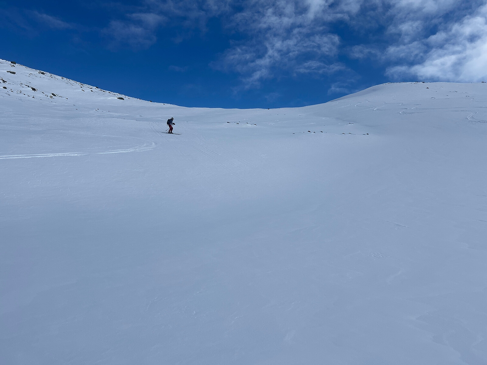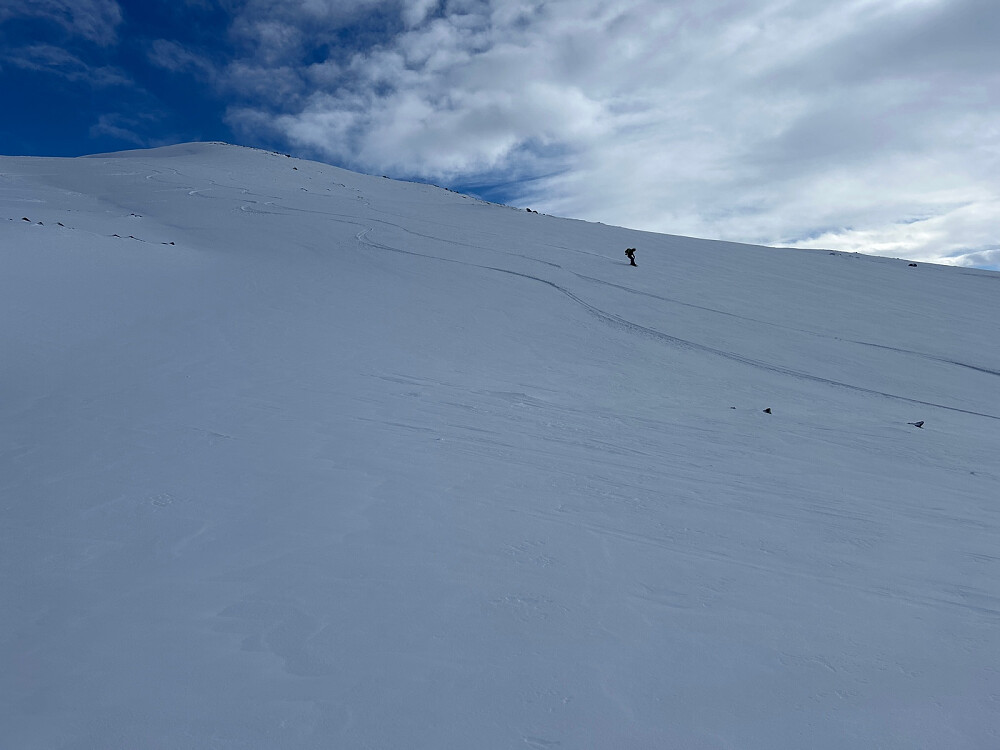 Med skare, stedvis gjennomslagsføre og et par centimeter nysnø ble nedkjøringen utfordrende for turfølge med fjellski. Jeg klarte meg ganske bra, og fikk noen fine svinger der jeg turte.