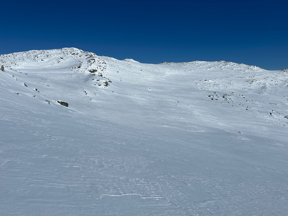 De siste 70 høydemetrene til toppen av Ruten var ganske steinete, så skiene ble parkert og vi gikk til topps med stedvis høye kneløft som ble den mest slitsomme delen av turen.