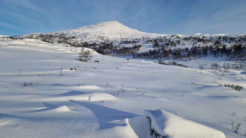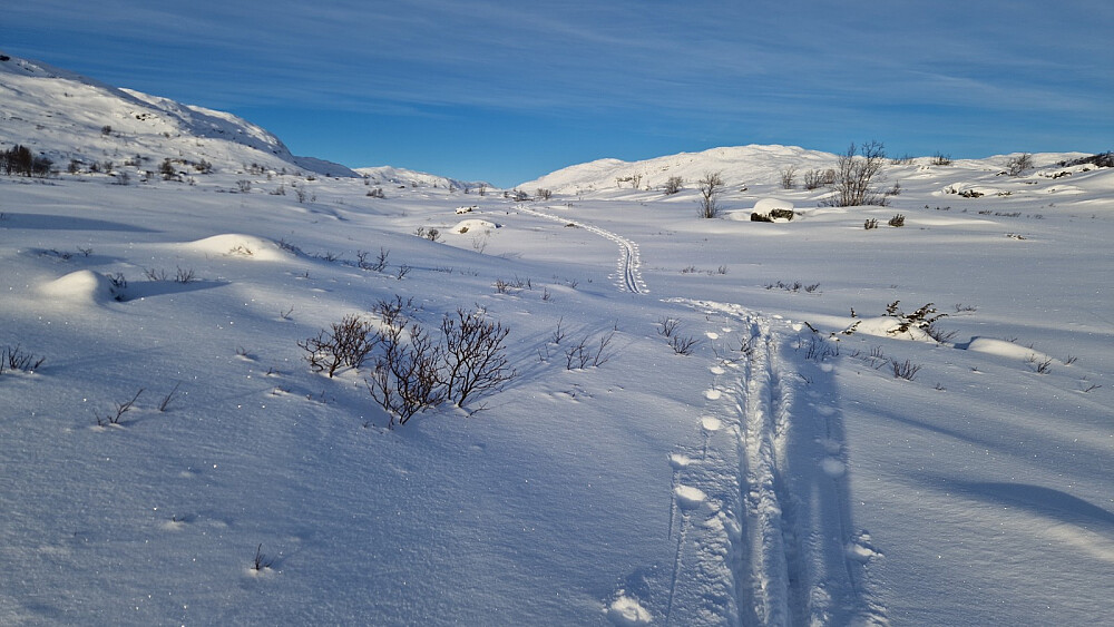 Rando med mykje flatt, men også fin køyring. Planla Skjeltrene, men gikk ut litt høgt i terrengen for å sjekke ut Vetle Frostdalen. Går nok greitt å gå inn der no. Men denne ruta gav meg noko kuppert terreng, tett bjørkeskog og djupsnø. Fasinerande, men det gikk smått. Etter kvart tangerte eg skispor litt nedanfor. Greitt. Inn Frostdalen, over vatnet, og opp sida. Greitt å gå opp her, då underlaget var hardare, og 10 cm nysnø oppå. Tungt etter kvart, då det kun var ein banan i sekken i dag. Fantastisk utsikt frå toppen. Morro køyring ned. Måtte svippe innom Sjekk-Ut på Frostdalen. På med fellene på vatnet, og beheldt dei på heilt nedatt. Litt froblem med tett bjørkeskog, mwn kom da greitt ned. Ikkje bratt. Godt sleten då eg var tilbake att ved Sluten. Minus 14 no. Fin dag :)