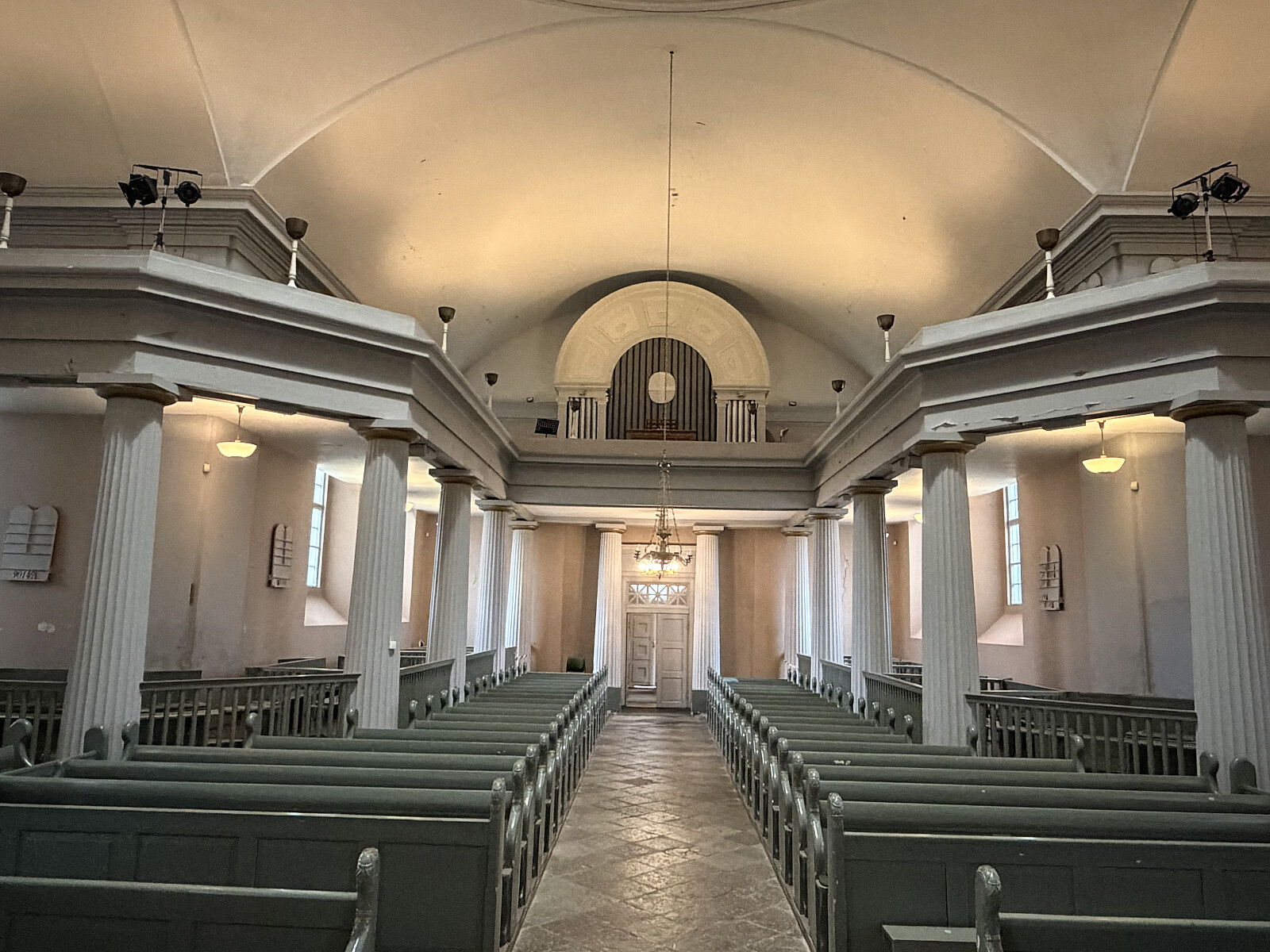 Innvendig hadde hovedaksen opprinnelig stenbenker uten rygg. I tverskipene var benkene lukket med dører. Benkene ble byttet ut i 1860 og har nå alle rygger og er malt i grått. Gulvet har røde og hvite diagonalmønstrete stenfliser. Kirkerommet er preget av søyler som holder oppe galleriet. Veggene i kirken er tilbakeført til den opprinnelige rosa fargen.