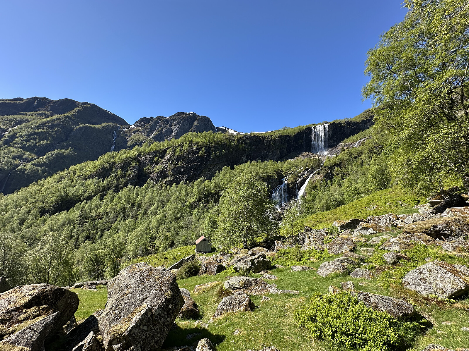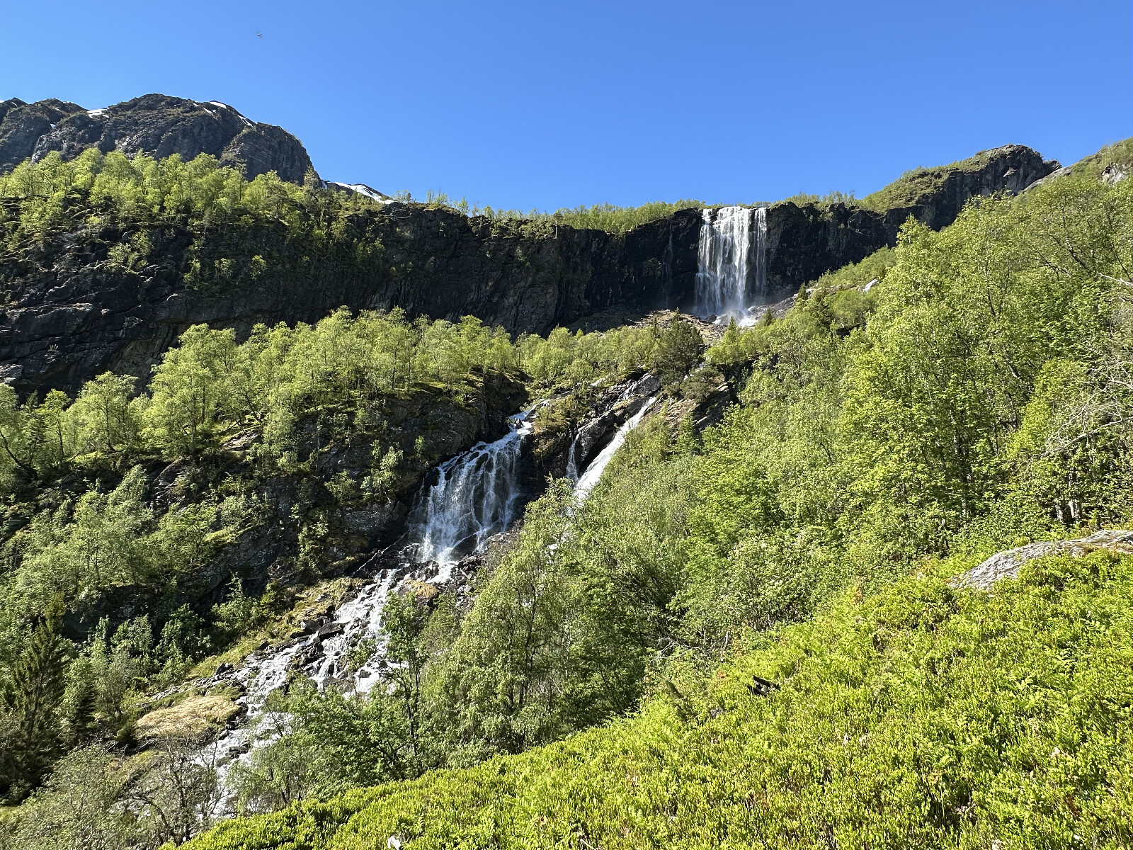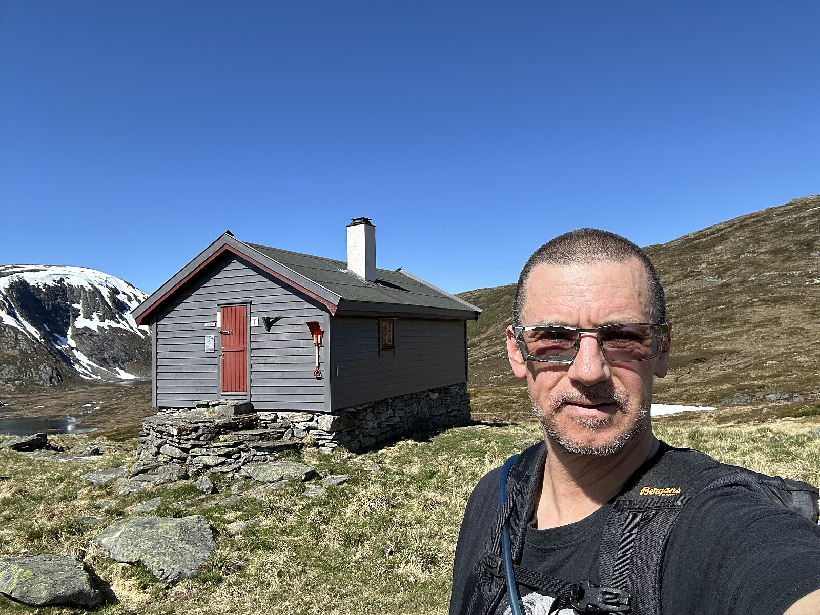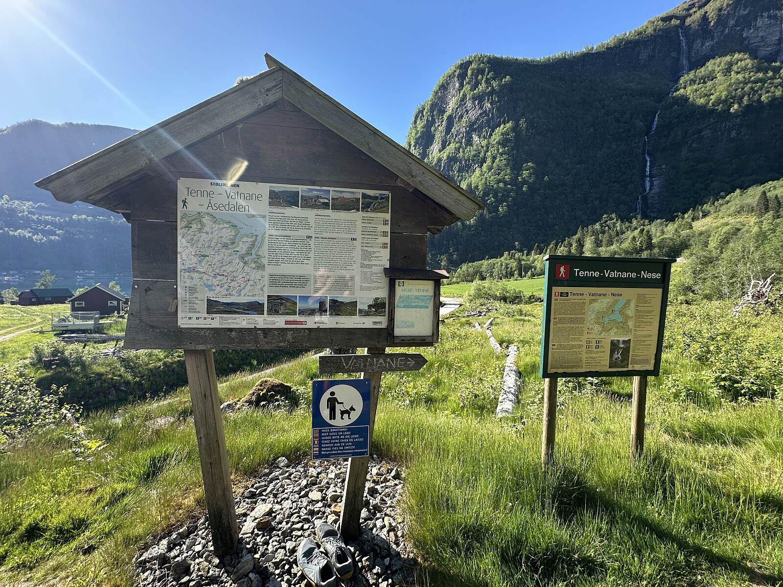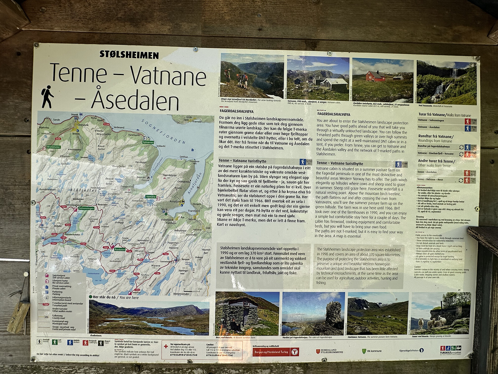 Parkerte ved et informasjonsskilt ved det lille stedet Tenne, som ligger innerst i Indrefjorden. Herfra på god umerket, men bratt sti, forbi stedet Fossesete og opp til vannet Vatnavatni på 809 moh. Sydøst utløpet steingås før den siste slake oppoverbakken til den ubetjente DNT hytta Vatnane. Hytte er liten og med bare 6 sengeplasser. Den ligger på et fint «tun» sammen med 7 andre små hytter. Fin utsikt og godt vær i dag.