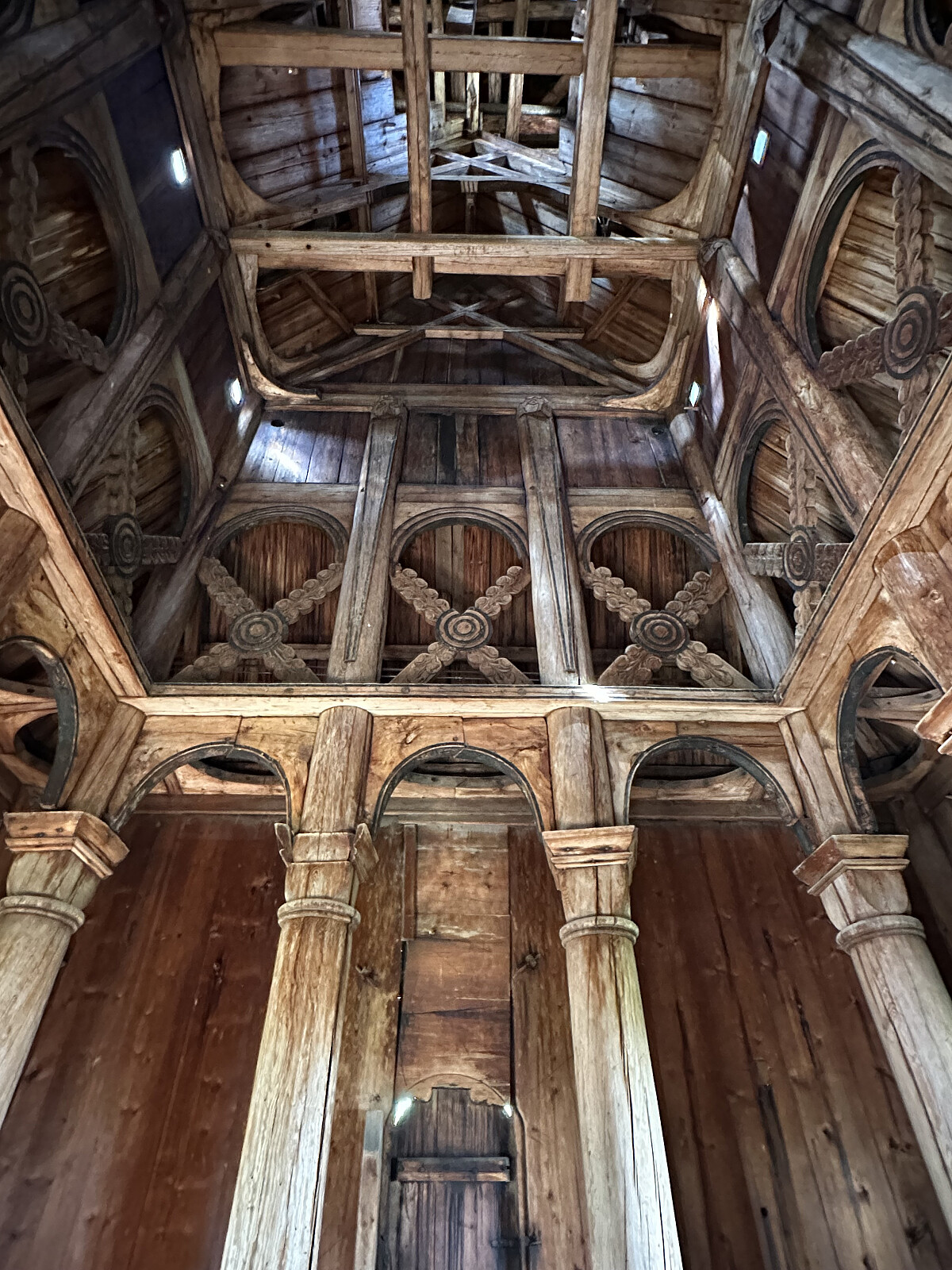Dietrichson oppga opprinnelig seks søyler på hver langside og to på hver av kortsidene, i alt 16 søyler, alle med samme innbyrdes avstand. Søylene danner et midtskip med forhøyet tak og fire siderom (omgang) med lavere pulttak. Bugge og Mezzanotte plasserer Torpo stavkirke (sammen med Heddal stavkirke) som bindeledd eller overgangsformer mellom «borgundgruppen» og «kaupangergruppen», fordi den har trekk etter begge.