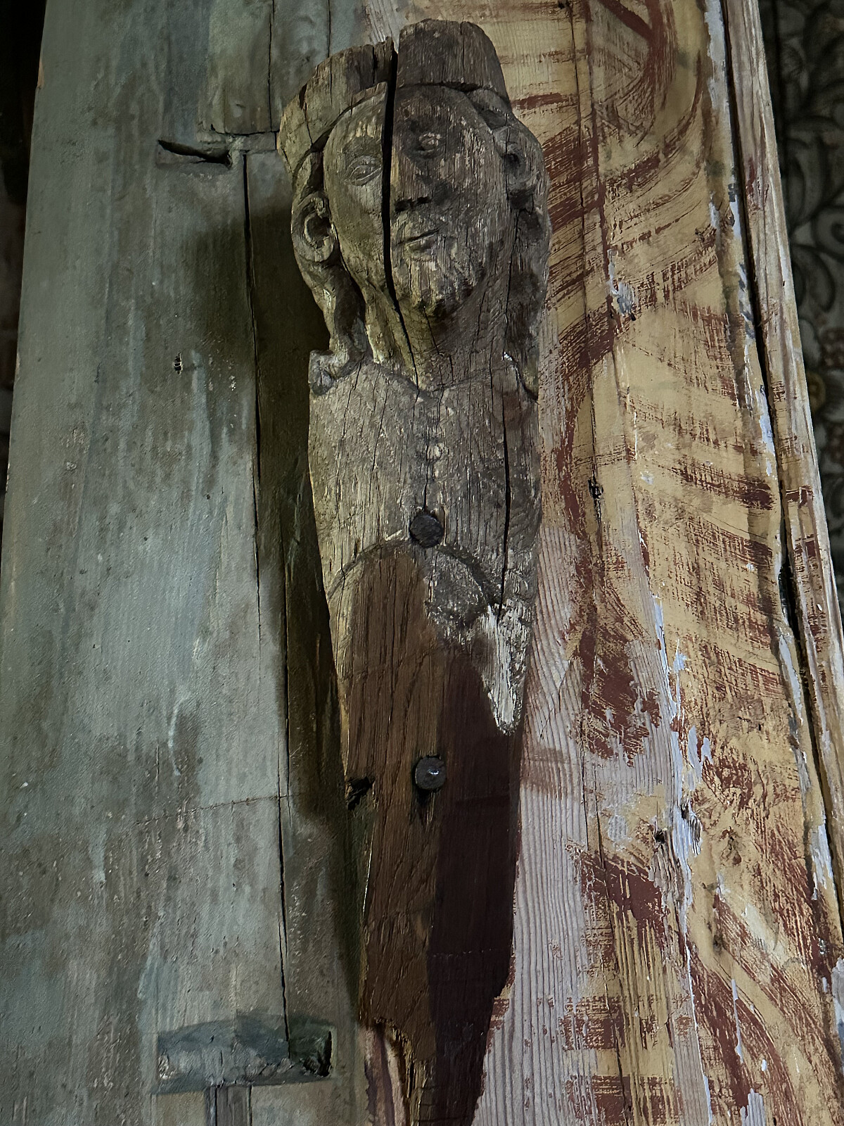 Vestportalen i skipet har to utskårne vangeplanker som går fra svill til stavlegje og opptar overstykkene i en not. Åpningen har vært flankert av halvsøyler, men de er blitt forhugget for den nåværende dør, som har sin toppkarm like under halvsøylenes kapiteler. Portaloverstykkene består av tre utskårne planker som er tappet inn i vangenes not. Døren har opprinnelig sittet på innsiden, men slår nå utover. Ombyggingen av døren kan ha skjedd i 1824, da det ble betalt «For at vende Kirkedørene».