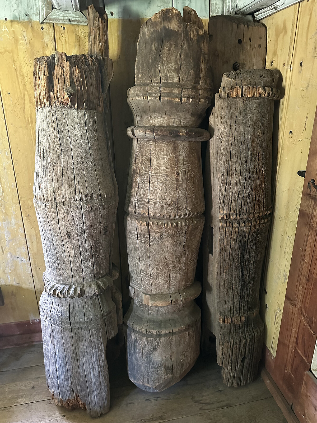 I middelalderen besto stavkirken av et skip som målte 5 x 6,4 meter og et kvadratisk kor som målte 2,25 x 2,25 meter, med en noe smalere apsis mot øst. Kirken hadde også opprinnelig svalgang hele veien rundt, inkludert et bislag med hevet tak over skipets vestportal. Midt på skipets to langvegger har det på hver gått ut en 1,2 meter dyp og 2,5 meter bred tverrarm med apsis (0,80 meter i diameter) ytterst. Det har vært uklart om disse tverrarmene er opprinnelige eller om de ble tilført kirken i middelalderen. Kirkens korsformede grunnplanen har tilsammen seksten søyler i midtskipet og fløyene, samt at det midt i skipet står en kraftig søyle med terningkapitel. Midtmasten går fra gulv til møne og er cirka 8 meter høy, med et sirkulært tverrsnitt på cirka 42 cm i diameter. Den har opprinnelig stått på en bjelke som har hatt opplegg i østre og vestre grunnstokk. Bjelken er imidlertid fjernet, og masten hviler nå på et fundament av stein. Fra stavlegjene i skipets 4 vegger går 4 bindbjelker til midtmasten.