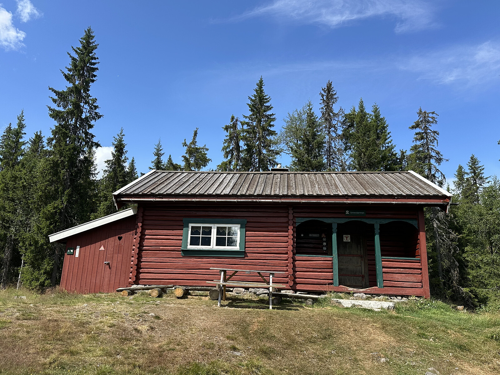 Kjørte tilbake til Tverrsjøstallen, og sørover på Sinderdalsveien. Like nord for vannet Store Sindera, har det kommet opp en ny relativt stor parkeringsplass. Parkerte her. Herfra på god sti rett sørover til man kommmer til en trebru. Rett over trebrua ligger Sinnerdammen. Fin lita hytte og veldig koselig og sjarmerende inni.