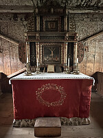 Interiøret er preget av stilen etter reformasjonen. Veggene og himling er malt med dekorasjoner (bladranker) i 1600-talls stil. Dekorasjonene fremstiller scener fra Jesus liv. Skipet >>>