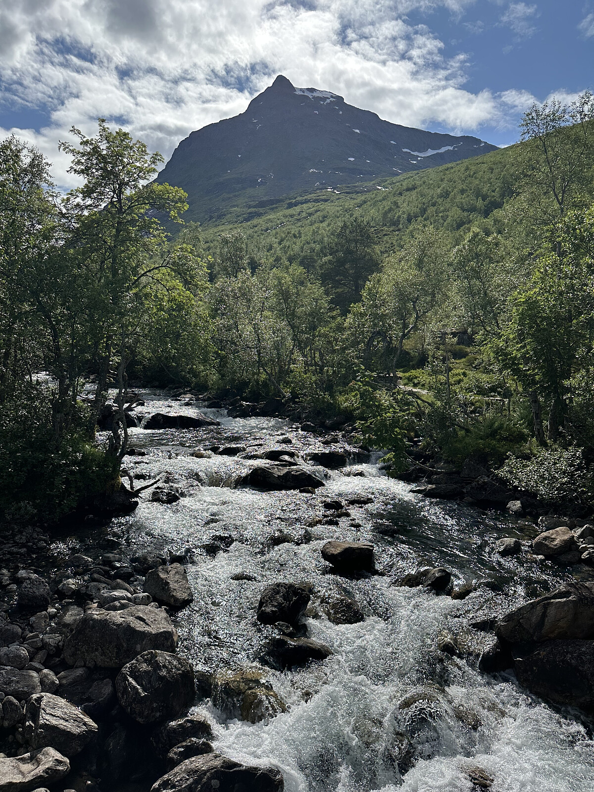 Kjørte innerst inni Isfjorden og videre på Vengedalsvegen. Bom i begynnelsen av veien. Parkerte ved Venjedalssetra P-plass. Herfra er det bare noen få meter å gå til den lille, men fine Venjesdalsbu. Hér er man mitt i smørøyet av flotte topper i Romsdalen. Rundt om dette stedet har man bl.a. Store Venjetinden, Romsdalshorn, Blånebba og stistart for den utrolig fine Romsdalsegg traversen.