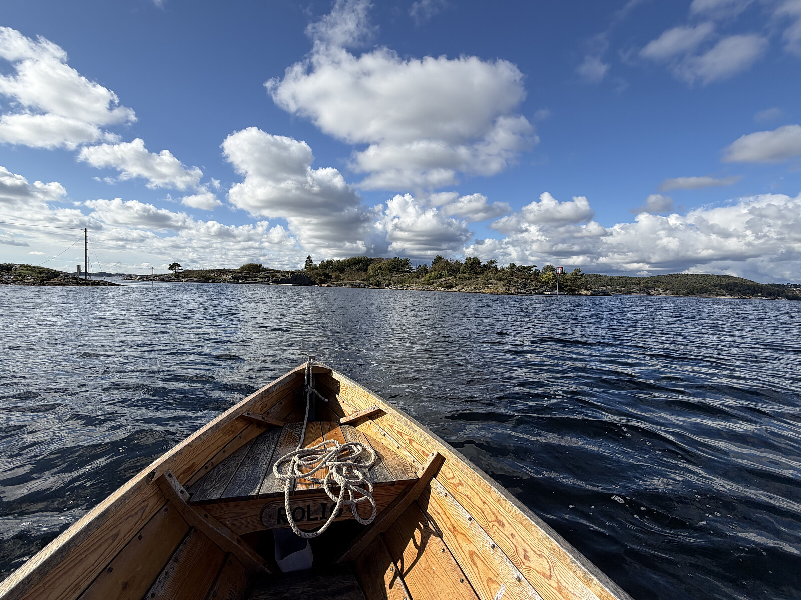 Kjørte ut til Flekkerøya, som ligger rett sør for Kristiansand. Videre til Lindebø brygge. Her står det 2 robåter som man kan få låne, når man bestiller opphold på hytta. Jeg hadde vært i kontakt med DNT Sør, og forklarte at jeg kun skulle ut på dagstur. Og siden ingen andre hadde bestilt opphold så fikk jeg lov til å få koden til den ene robåten, og koden til å få ut nøkkelen til Gammeløya. Litt vanskelig å få opp låsen, men gikk greit etter en stund. Brukte ca 35 min ut til brygga som ligger på sørsiden av øya. Litt vind i dag, så litt tungt å ro, men fikk fortøyd, og så på god sti de 150 m som var igjen til hytta. Koselig romslig hytte, med flott utsyn utover skjærgården.