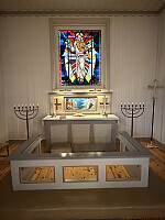 Besøkt 12.45 Her er det IKKE Kirkeskip Slemmestad kirke er en langkirke i tre med 180 plasser. Den ble tegnet av Ivar Næss og innviet den 25. august 1935. Kirken ble utvidet mot øst med menighetssal og andre rom i 1960. Dette ble ytterligere forlenget østover i 1978, og da undertegnede fotograferte kirken i januar 2010, foregikk det også arbeider her som nå ser ut til å være fullført. Selve kirken har klassisk struktur med rektangulært skip, smalere, kvadratisk kor i øst, sakristi sør for koret og dåpssakristi på nordsiden. Vesttårnet har kvadratisk grunnflate og trapperom på begge sider. Kirkens historie (bakgrunn, bygging, utsmykning) er skildret mer detaljert i Norges kirker og hos Slemmestad og Nærsnes menighet. Førstnevnte titulerer kirken som kapell. I dag brukes imidlertid >>>