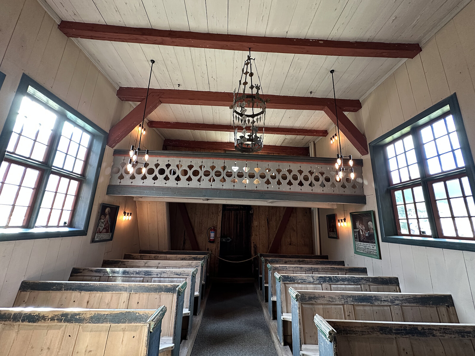 Inngangsportalen til kirkerommet fra våpenhuset består av et to etasjers høyt utskåret relieff i tre med ornamenter.