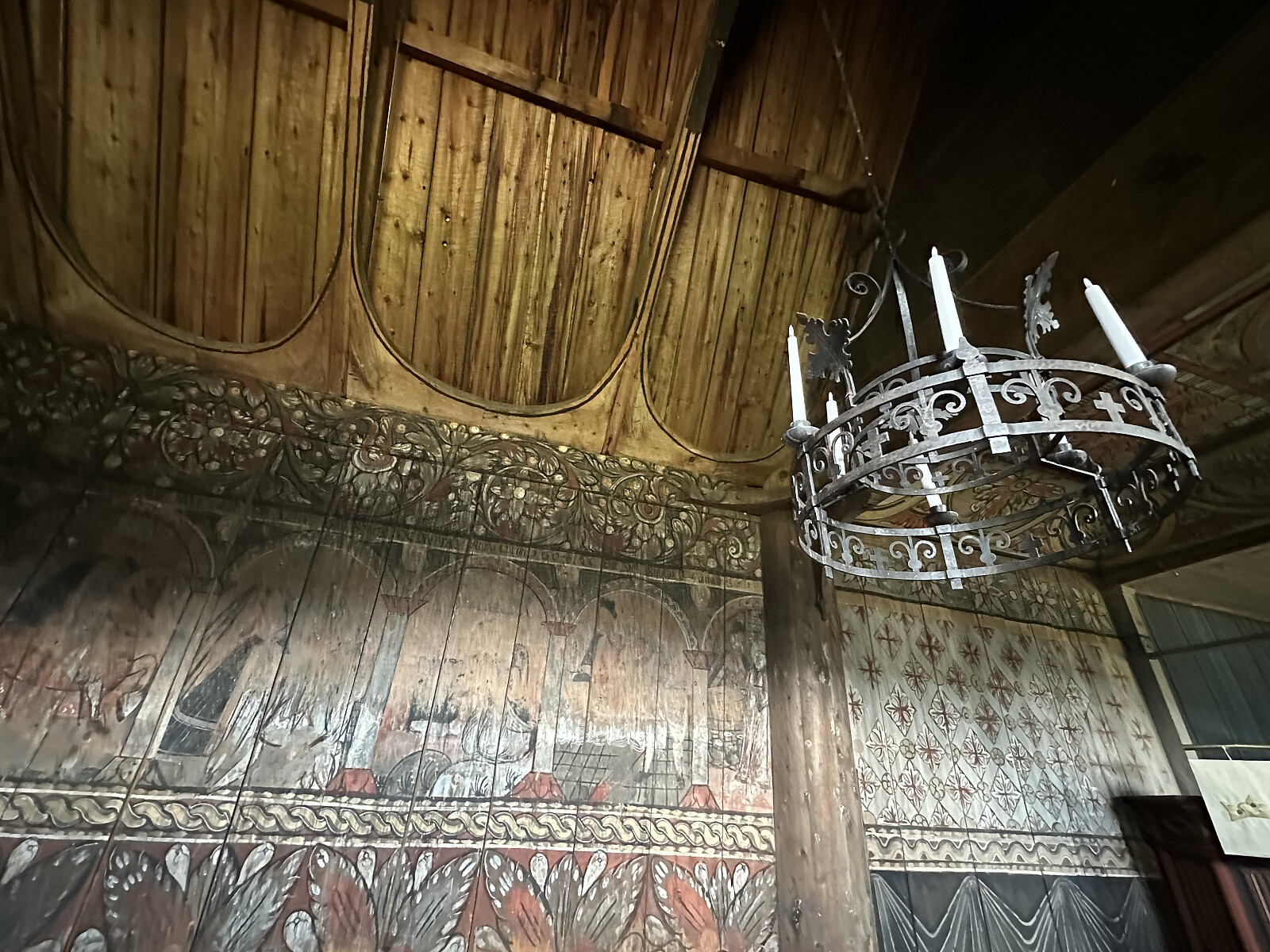 Kirken er første gang nevnt i skriftlige kilder i 1354. Bygget antas å være oppført omkring 1250. Forkullede trerester under den eksisterende kirken tyder på at det har stått et bygg på stedet tidligere. I 1825 ble skip og svalgang forlenget mot øst. I 1845 ble et kor i laftet tømmer tilføyd, og kirken fikk innvendig panel. Den ble restaurert på 1920-tallet, og innvendig panel ble da fjernet og veggmaleriene fra 1600-tallet avdekket og >>>