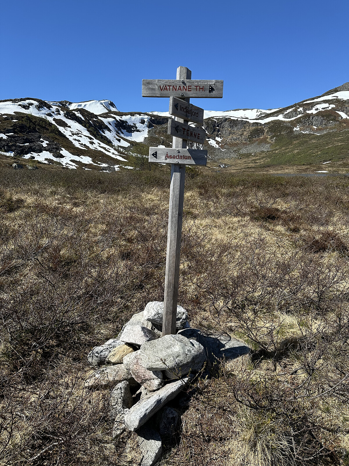 Parkerte ved et informasjonsskilt ved det lille stedet Tenne, som ligger innerst i Indrefjorden. Herfra på god umerket, men bratt sti, forbi stedet Fossesete og opp til vannet Vatnavatni på 809 moh. Sydøst utløpet steingås før den siste slake oppoverbakken til den ubetjente DNT hytta Vatnane. Hytte er liten og med bare 6 sengeplasser. Den ligger på et fint «tun» sammen med 7 andre små hytter. Fin utsikt og godt vær i dag.