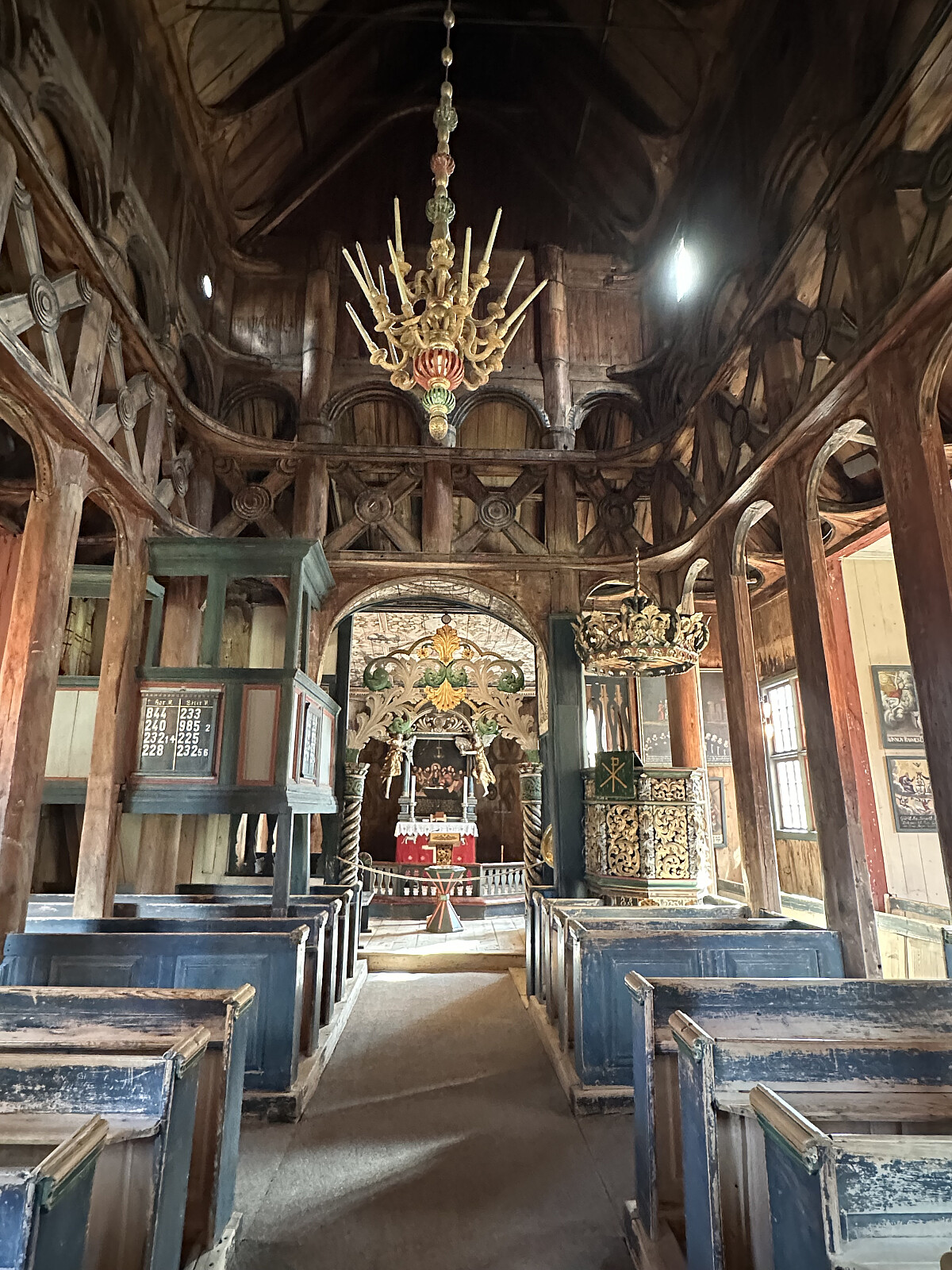 Inngangsportalen til kirkerommet fra våpenhuset består av et to etasjers høyt utskåret relieff i tre med ornamenter.