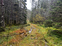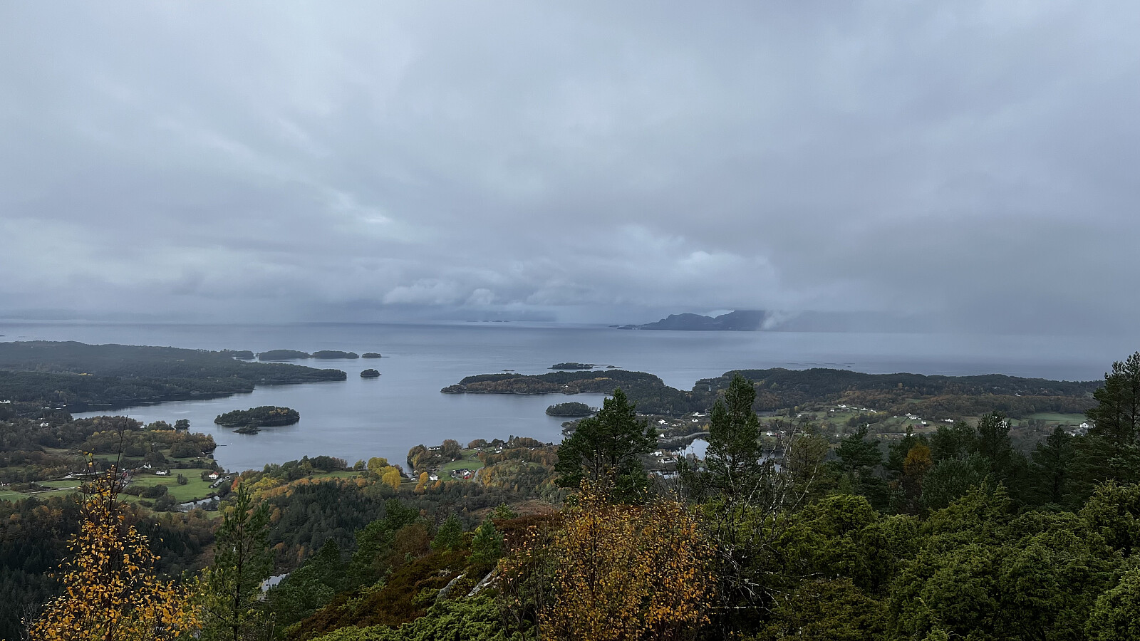 Hadde i forkant bestemt meg for å ta en ny tur ned til Tysnes for å “utvide horisonten litt” når det gjelder nye topper. Denne dagen var det fokus på skogstopper. Litt ruskevær, men lite vind. Rakk fergen fra Halhjem med 5 minutters margin. Fra Våge kjørte jeg inn i Sanddalen der Hovda var først ut. Kjørte så langt inn jeg mente det var forsvarlig. Parkerte utenfor en port. Her var det også fint å snu. Med podcast om Nansens bragder på øret, var det null problem å komme seg ut i duskregnet og starte jobben i det våte terrenget.