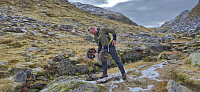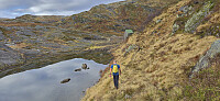 Det var et lettgått terreng. Mildt i luften og varmt når solen etter hvert kom frem. Kunne derfor fint gå i bare t-skjorte. Da Harald skulle gjøre et stopp, gikk jeg litt i forveien. Etter at jeg kom over åskammen, så jeg ikke noe mer til ham. Spottet ham et stykke lenger oppe, men jeg antok at vi kom til å treffes et sted lenger borte. Det skjedde aldri.