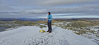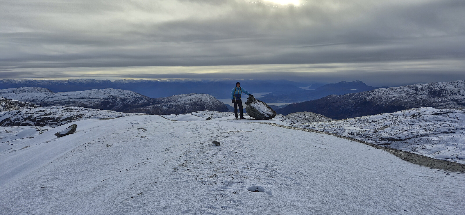 Fant et fint klyveparti som var gøy. Harald ringte meg da jeg hadde 300 meter igjen til toppen. Han var ikke så langt bak. Vi møttes på toppen. Tok en matpause her oppe. Flatt og fint platå med en toppvarde på en stor stein ved siden. Middagshorgi er en ganske utilgjengelig topp. Flott utsikt over Hardangerfjorden.
