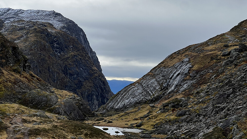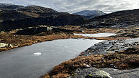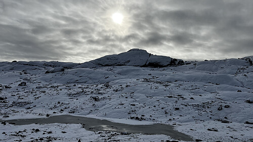 Tok av fra stien og gikk ned til Songrøvatnet. Her kom vi inn igjen på den den delen av stien som går ned i Trongedalen. Ved demningen i vest-enden tok vi på ny av fra stien og denne gang måtte vi navigere resten til toppen.