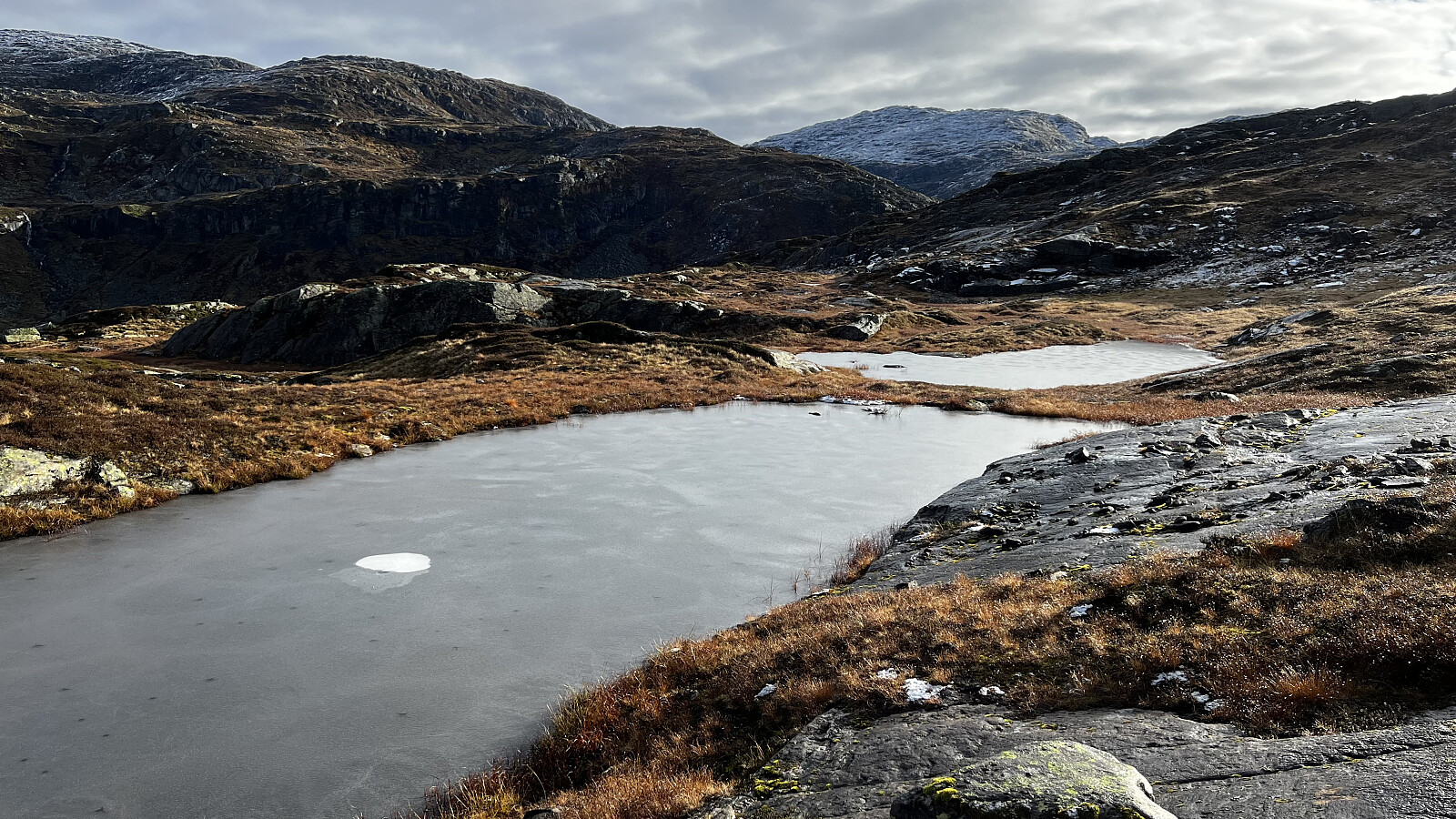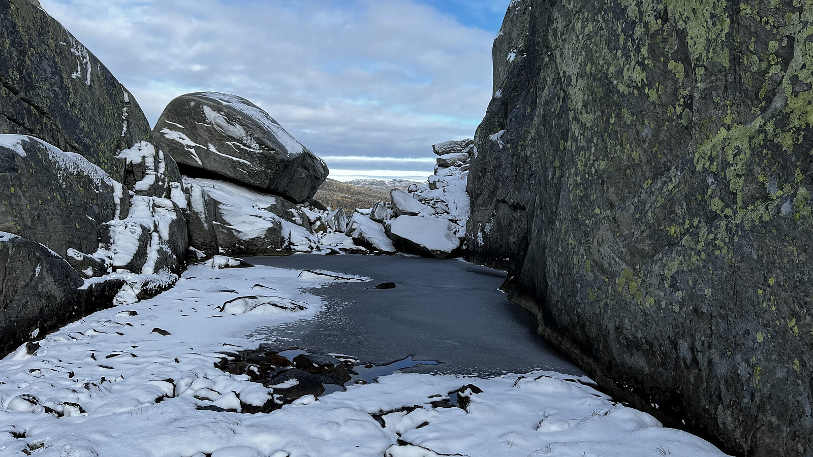 Kom etter hvert opp i snøen. Irriterende lite. Det var bare et melisdryss og til tross for at det alltid gleder meg å se nysnø, er et så lite lag faktisk mer irriterende enn den er til nytte. Den skjuler isen som lusker over alt, og mengden er akkurat nok til at en kan skli på det når en tråkker på steiner. I tillegg synes jeg bildene blir ganske grå og kjedelige.