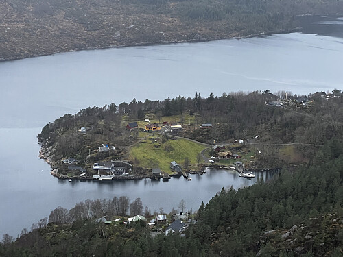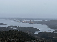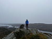 Kjørte over til fastlandet igjen. Nå var det Øksefjellet som skulle til pers. Slet med å finne en egnet plass å parkere, så vi endte med å stille oss i veikanten like ved stistart. Godt merket sti med blå og hvite pinner. Var ganske vått i terrenget her med mye myr, jord og gress. Det regnet også litt nå. Fin og oversiktelig utsikt mot plattformene ved Skipavik fra toppen. Skrev oss inn i boken og fulgte samme rute ned igjen til bilen.