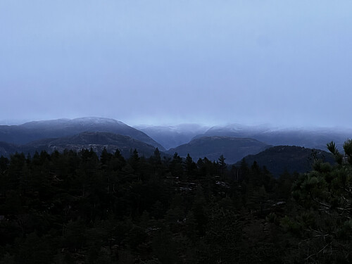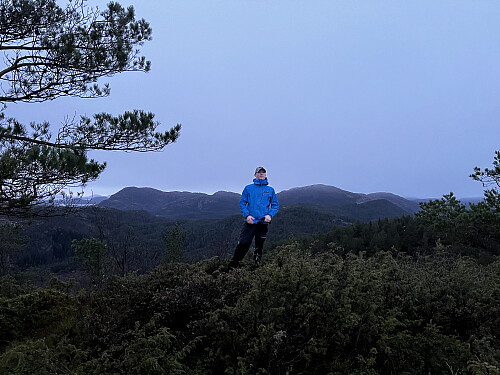 Sjette og nest siste topp for dagen ble Orretuva. Parkerte på en inngjerdet offentlig/privat plass ved Fivelsdal. Herfra fulgte vi hovedveien et lite stykke til fots før vi fortsatte på vår egen rute i terrenget. Diverse hjortetråkk oppover i starten, men stort sett god gammeldags baksing i veldig lettgått terreng. En smådryg rygg hvor vi omsider fant det høyeste punktet, midt i skauen. Kan trygt si at dette var dagens kjedeligste topp. Fulgte samme rute ned igjen til bilen. Tok på hodelyktene det siste stykket langs veien.