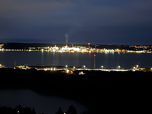 Det var blitt mørkt for lengst. Vi parkerte på en stor P-plass og fulgte god sti til toppen av Kistefjellet, som vi nådde etter kort tid. Lysene fra Mongstad dominerte utsikten. Idet vi skulle ta fatt på returen, døde hodelykten min. Heldigvis har jeg lykt på klokken som jeg alltid kan bruke i en nødsituasjon. Kom oss greit ned igjen til bilen.