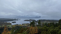Hadde i forkant bestemt meg for å ta en ny tur ned til Tysnes for å “utvide horisonten litt” når det gjelder nye topper. Denne dagen var det fokus på skogstopper. Litt ruskevær, men lite vind. Rakk fergen fra Halhjem med 5 minutters margin. Fra Våge kjørte jeg inn i Sanddalen der Hovda var først ut. Kjørte så langt inn jeg mente det var forsvarlig. Parkerte utenfor en port. Her var det også fint å snu. Med podcast om Nansens bragder på øret, var det null problem å komme seg ut i duskregnet og starte jobben i det våte terrenget.