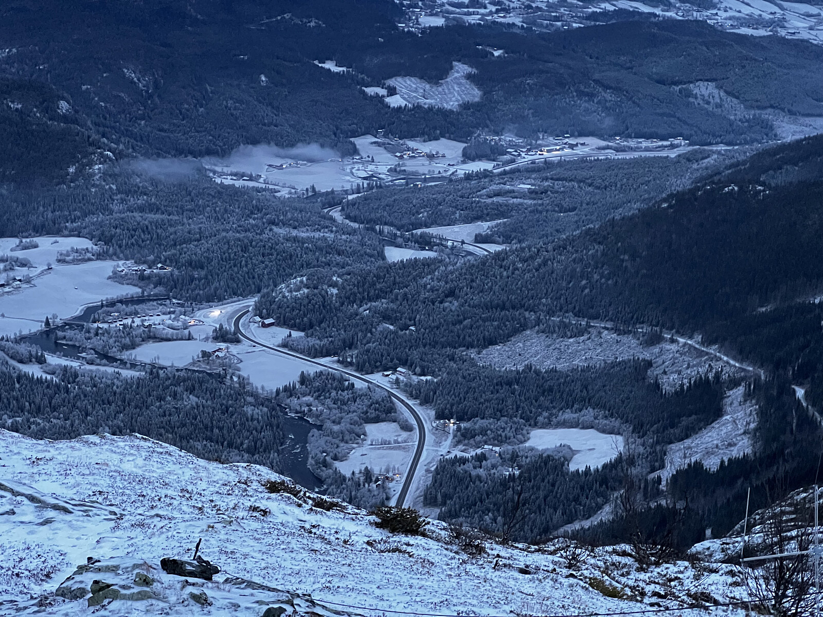 Kom etter hvert inn på stien, som vi fulgte til topps. Rakk det like før det begynte å skumre. Sleipt og glatt. Grunnet at vi bare hadde to par med brodder, måtte jeg klare meg uten. Tok på hodelykten på vei ned. Alltid like koselig med hodelykt i skogen. En fin og rolig tur.