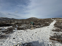 Jotunheimvegen var åpen den, men det hadde kommet litt snø. ikke nok til å stenge vegen tydeligvis. Parkerte på p-plassen til for Falkefangeranlegget, og fulgte stien forbi det. Sti videre innover til det ble bratt og stien forsvant. Lett å gå siste bratta opp til toppen.