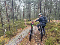 Parkerte på parkeringsplassen på Blåhøeveien like ved rasteplassen der stien startet. Stien var stedvis ganske grov med en del stein, men for det meste grei å sykle. Måtte av og dytte kun et par ganger i noen bratte kneiker, men ellers var det bare å sykle helt til toppvarden.