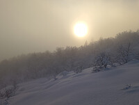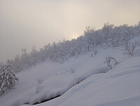 Mye tåke i skiktet mellom lavland og fjell. Mye sol over det. Etterhvert lurte tåka litt rundt toppen også. Spennende lys og svært godt føre.