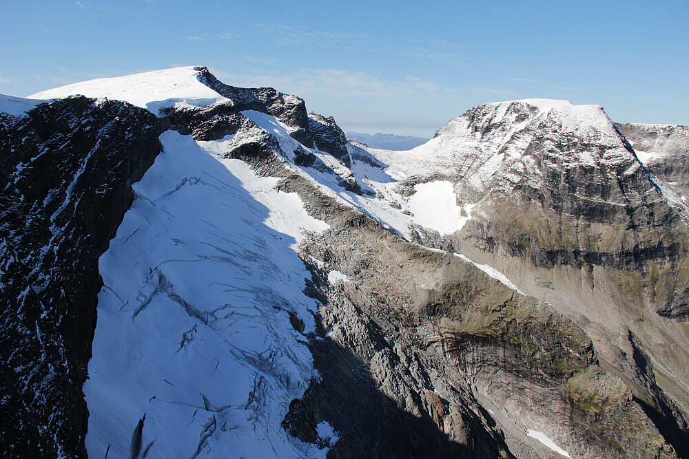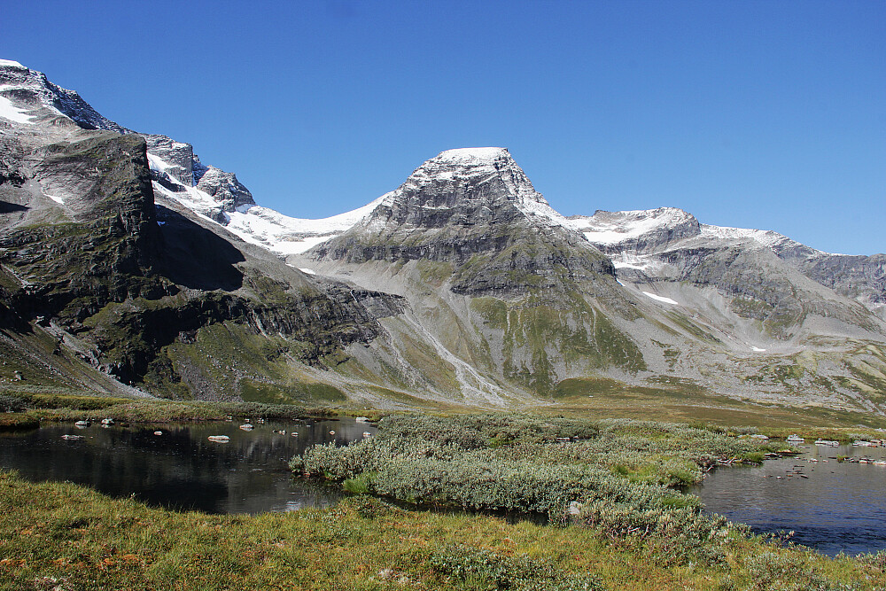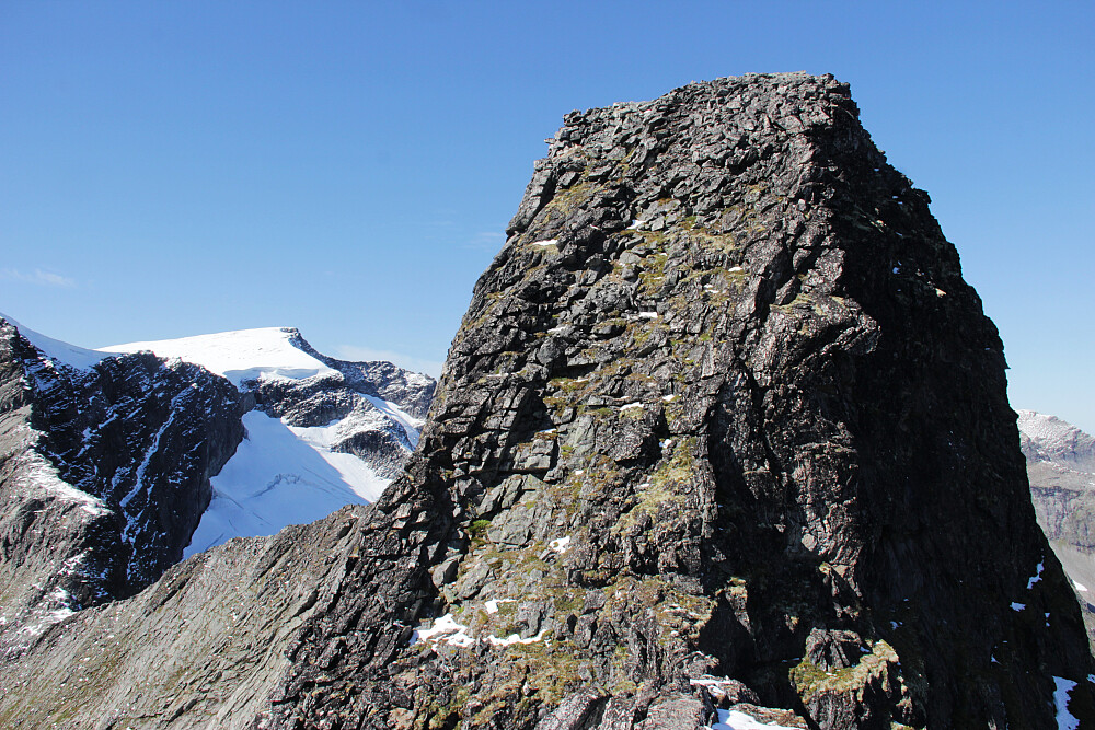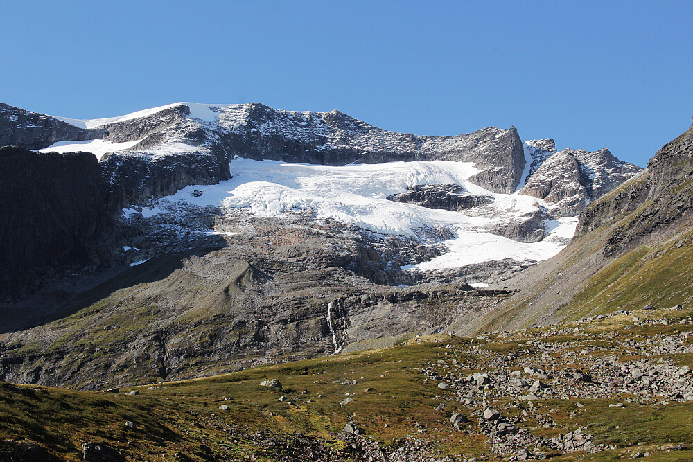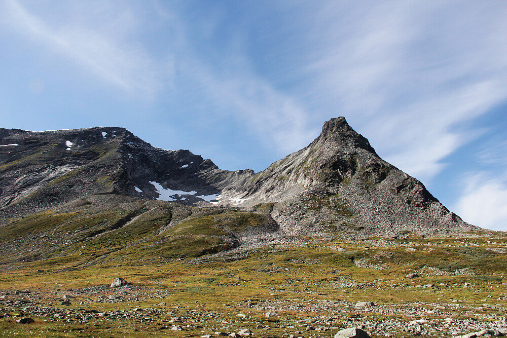Det gikk fortsatt an å følge en mer eller mindre tydelig sti, innover langs vatnet, på skrå opp en markert morenerygg og inn mot elva. Opp Storvasshornet skifta turen karakter fra lettgått, til tungt/bratt terreng. Prøvde å legge ei rute som unngikk ur og hamre, og lykkes tålig bra med det. Allikevel blei det både fast og laus stein før jeg nådde fortoppen. Artig egg på begge sider av fortoppen, før det gikk bratt, men greit til topps. Flott utsikt.